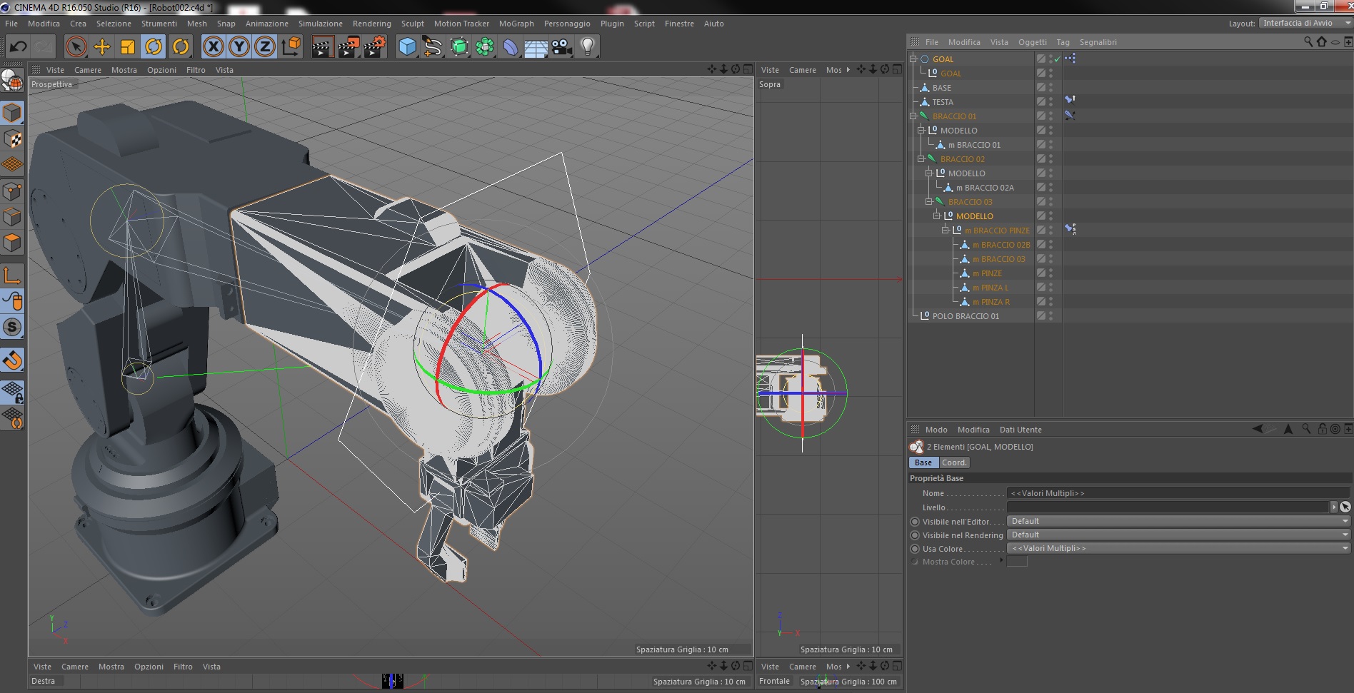 voglio far si che, ruotando la maniglia x dello screen, ruotino le parti del modello selezionate; al contrario, ruotando la maniglia z, voglio che ruoti solo il braccetto delle pinze, poichè l'altra mesh deve rimanere allineata col corpo del robot.