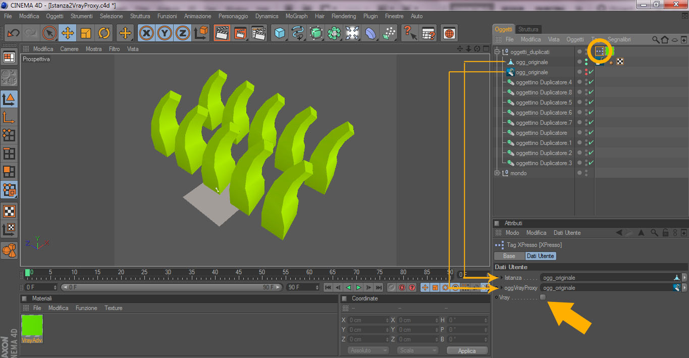 4_ si moltiplicano le istanze di cinema dell'oggetto originale che si desiderano (lasciandole nell'oggetto nullo a cui è applicato il tag Xpresso)
