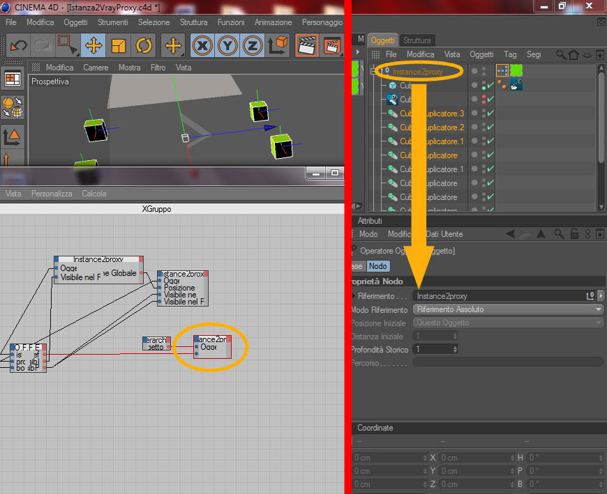 3_ si trascinano l'oggetto originale e il VrayProxy Generator all'interno del tag nelle caselle come indicato nell'immagine
