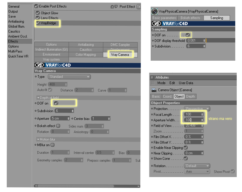 neanche a me funzionava all'inizio la DOF e proprio non me lo spiegavo, fin quando non mi ricordo neanche dove, ho letto che per far funzionare la DOF si deve impostare la lunghezza focale e l'apertura della camera su 100 e non 36 come di default.