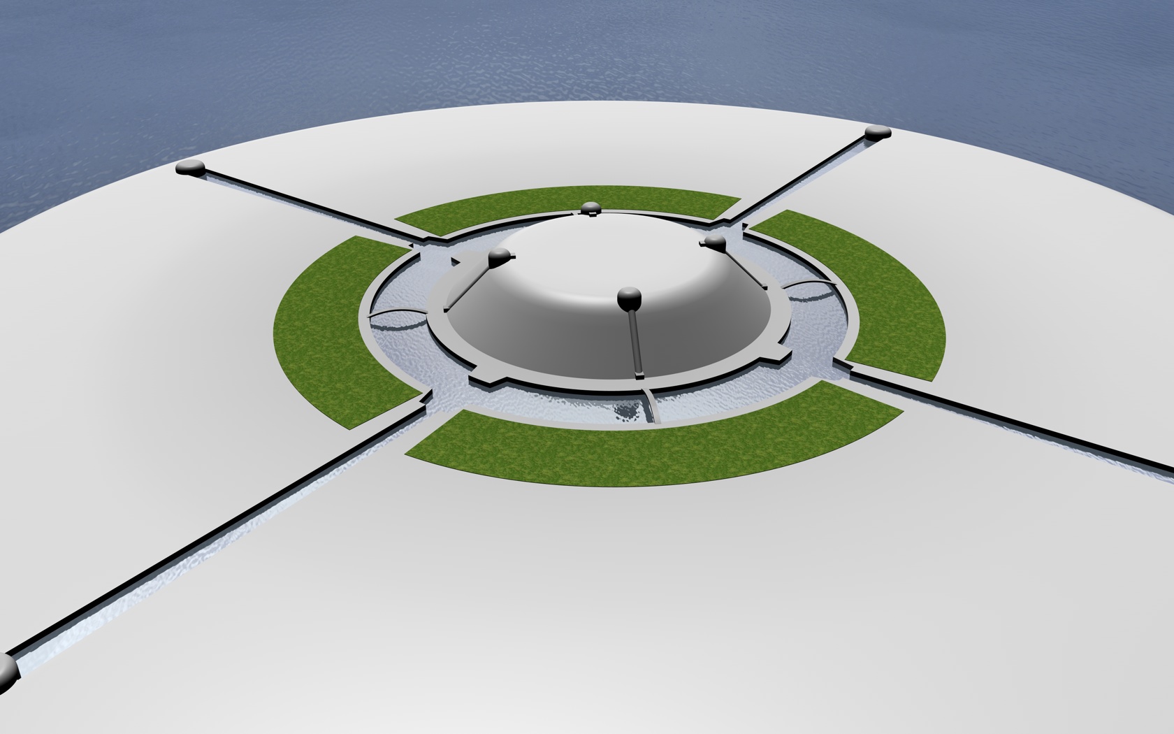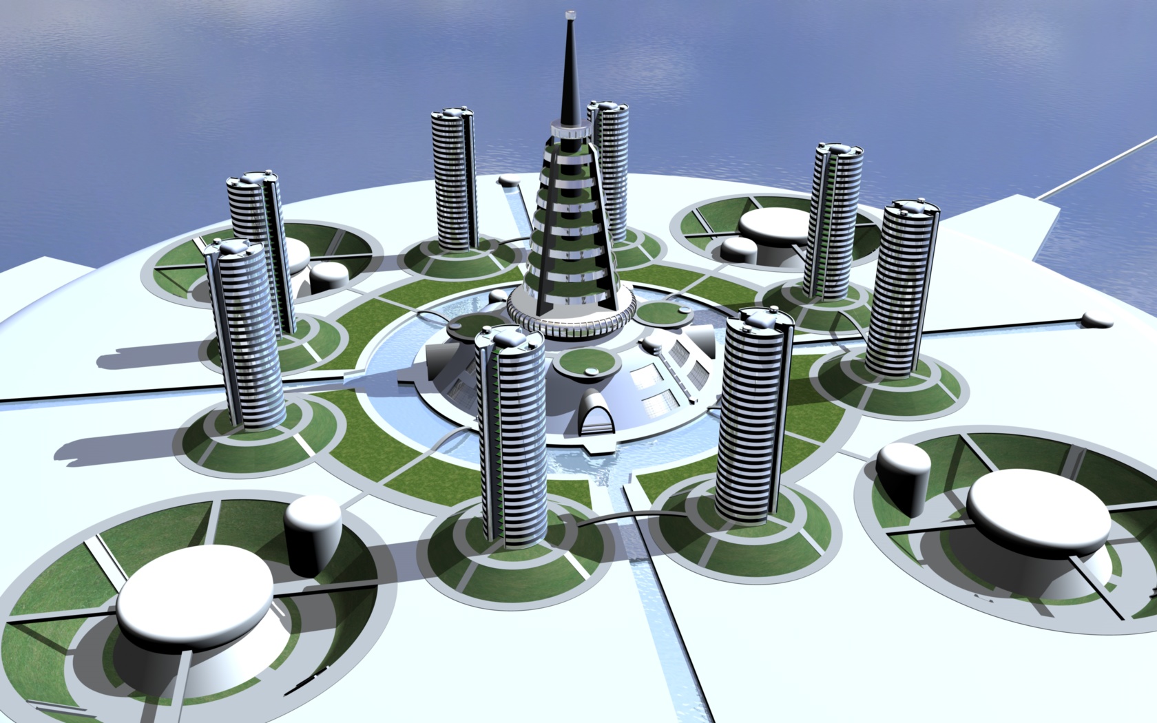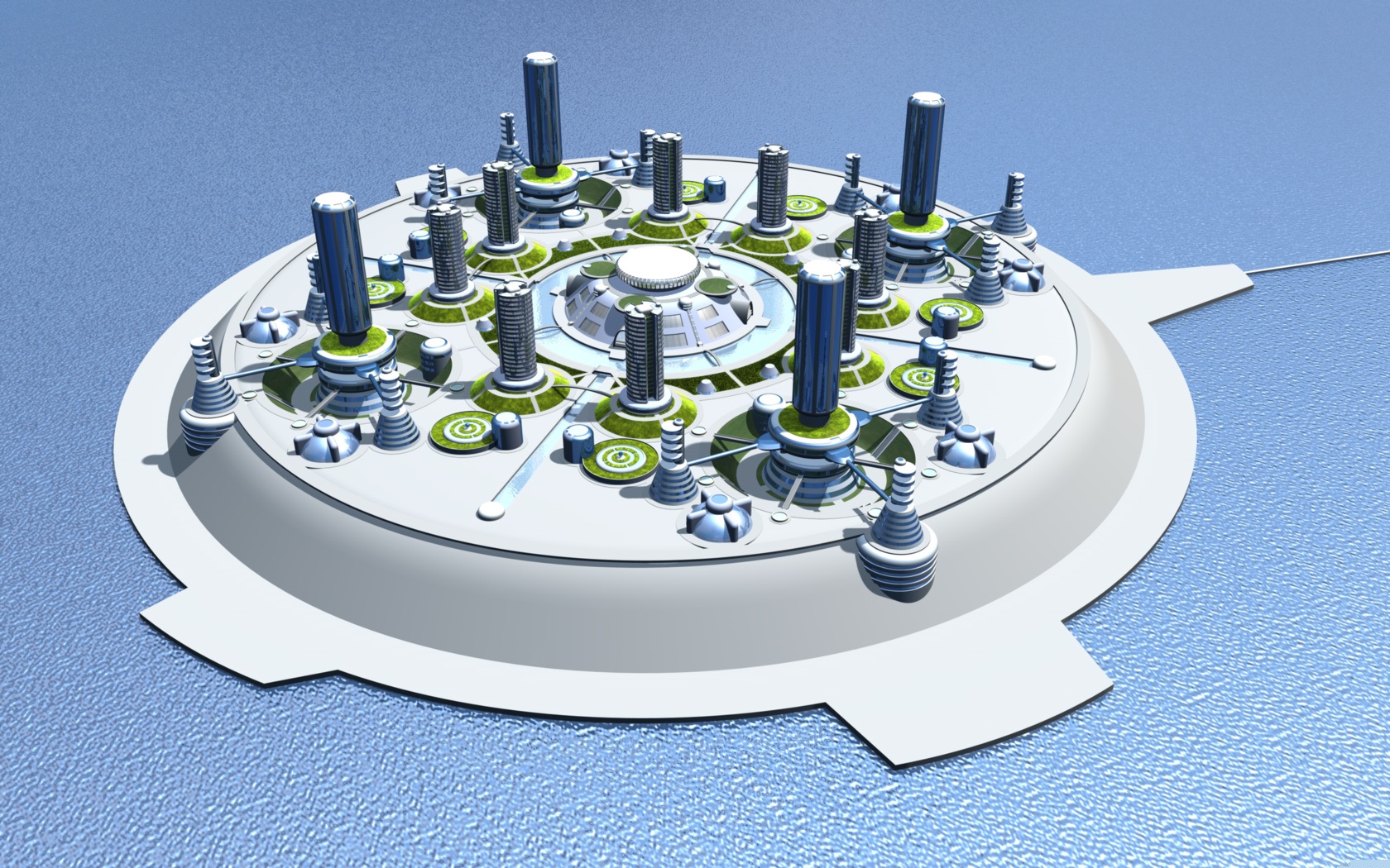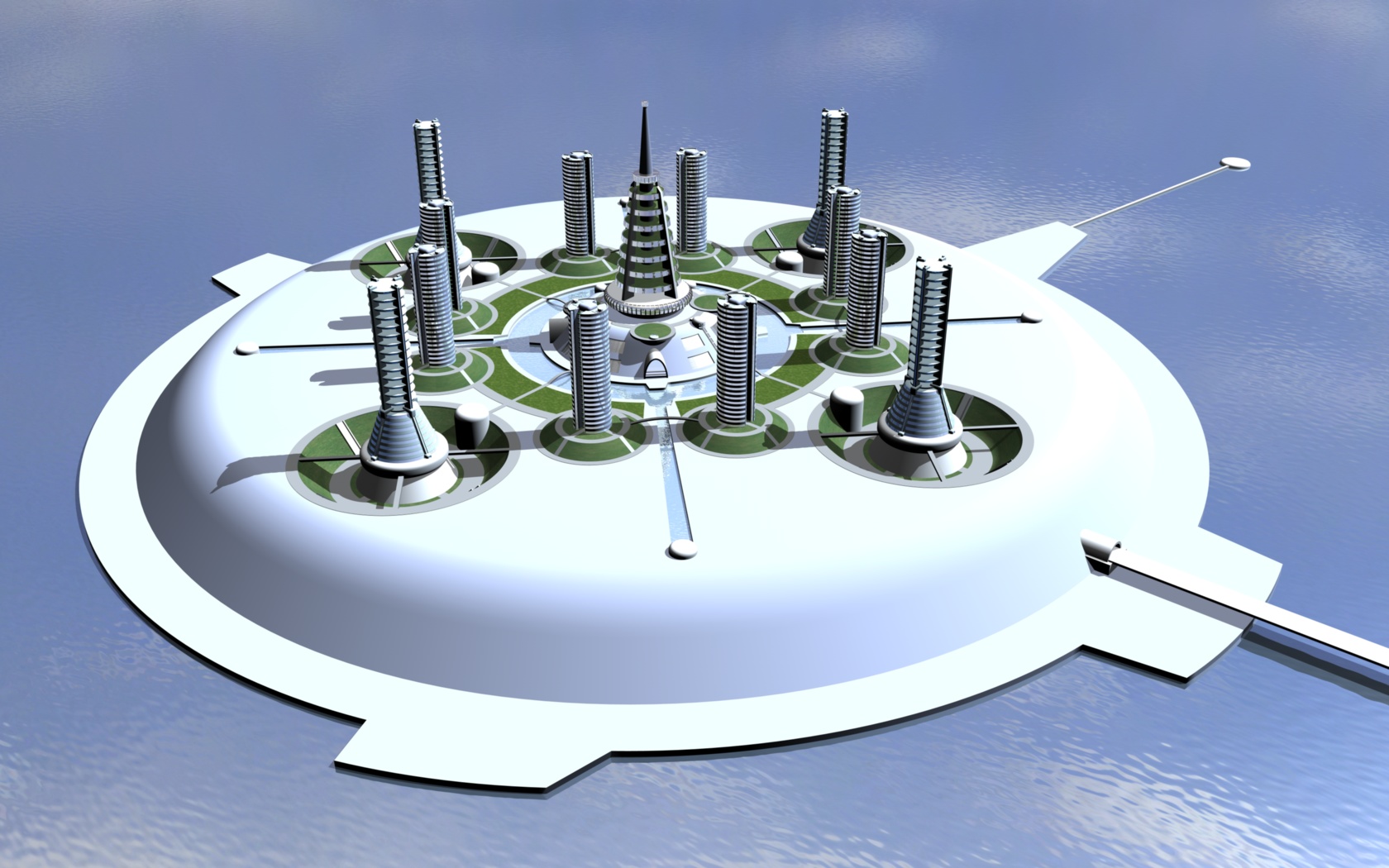 Questa struttura, enorme struttura, diventerà una microcity autonoma e autosufficente collegata apparte il via mare, da un unico ponte con un sistema T-Maglev per il trasporto civile. Ho preferito optare per una dimensione ridotta in termini di scala per poter eliminare il passaggio di troppi dettagli che mi impegnerebbero un po troppo come primo lavoro.