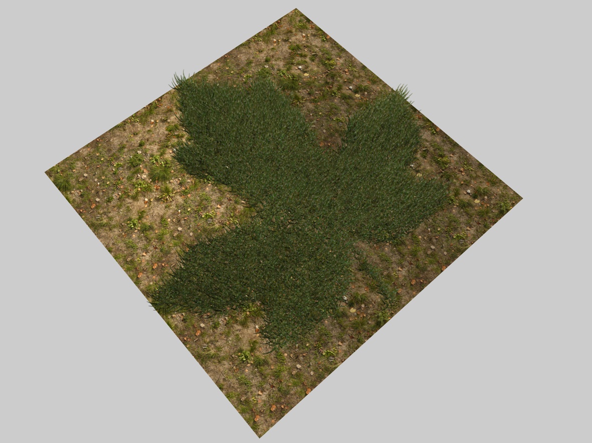 se vuoi puoi usare questa "ciocca" d'erba, vari l'altezza, la posizione, la alzi o l'abbassi rispetto al piano così da far spuntare solo qualche cmq e la metti dove vuoi. (pesa meno di hair)
