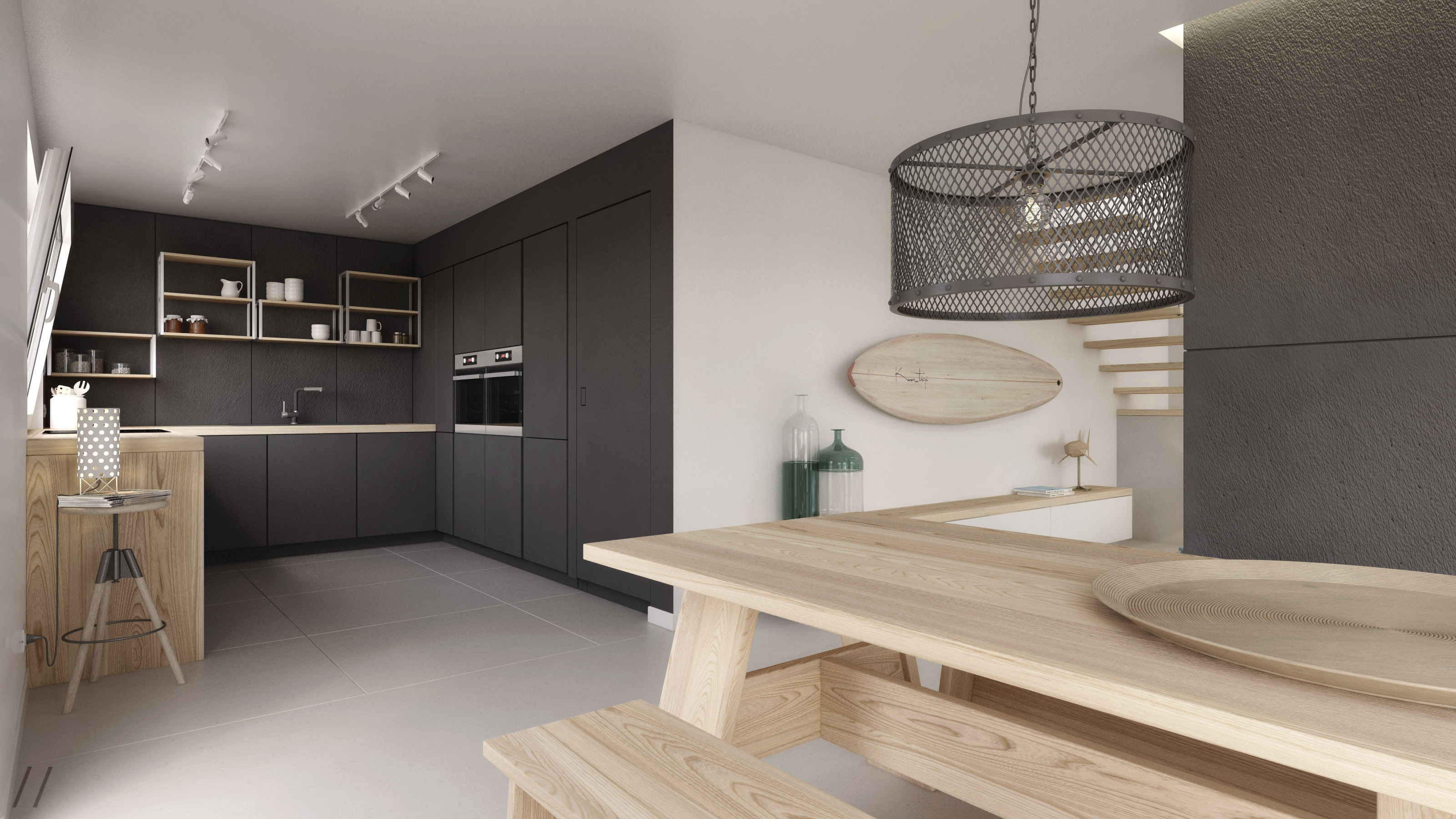 Per quanto riguarda invece gli accessori ho preferito stare il più minimal possibile, per sottolineare e rafforzare la natura contemporanea del progetto. Ad essere sincero col senno di poi manca qualcosa al centro del cestino sul tavolo, l'unica cosa che in realtà mi salta all'occhio.