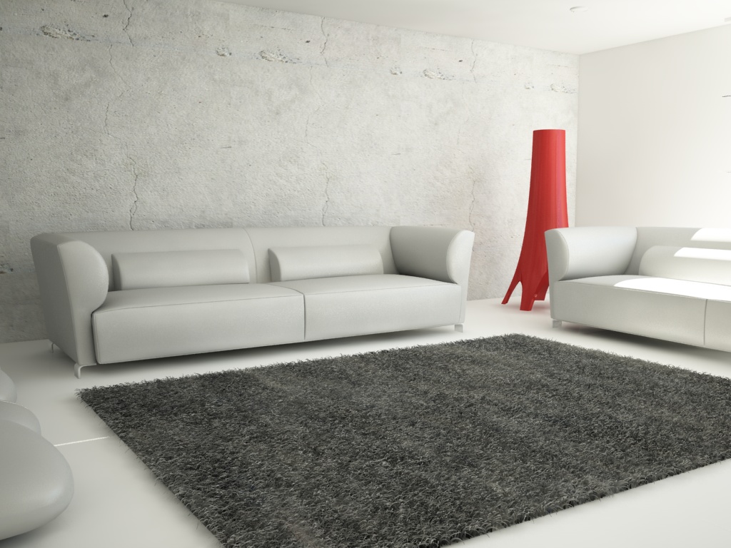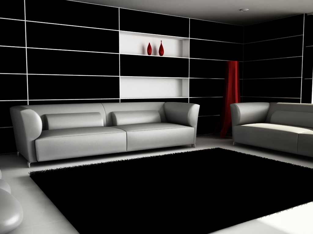 I materiali: non mi entusiasma la scelta del tutto bianco/nero: prova a variarli. Mentre il divano ci può stare (e non è male, come materiale), il resto non lo vedo molto azzeccato. D'accordo che è un test, però prova a cambiare i materiali dell'arredo, usare solo la Sun Light e cambiare il Color Mapping............