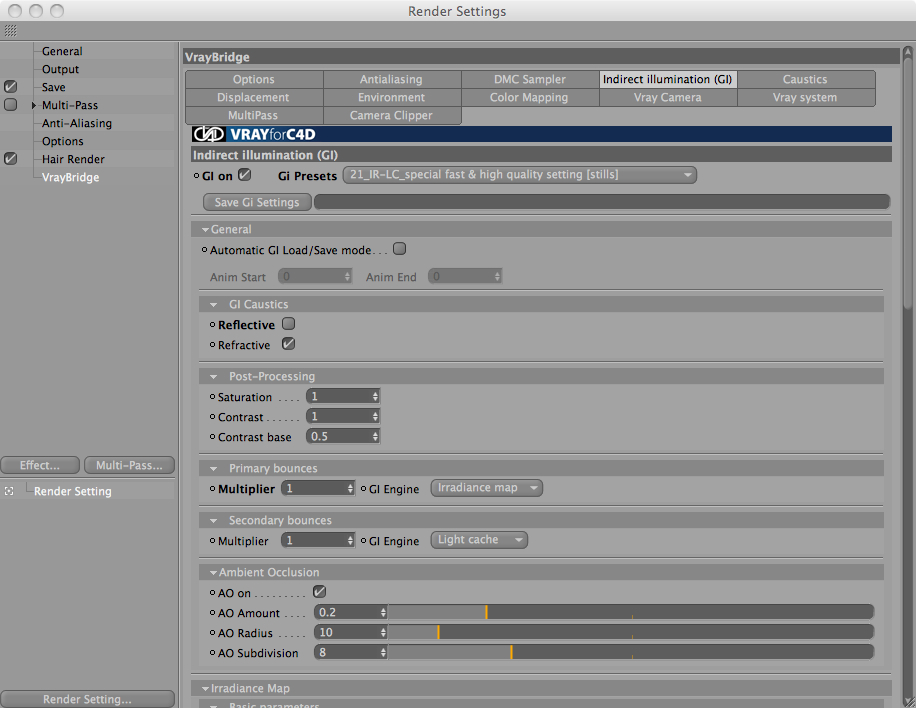 così è meglio,metti nel color mapping il clamp level a 3 e l'antialiasing 1-16-0,005,nella irradiance map hemispheric sub 80,nella light cache subdivision almeno a 1500,per un buon render a 2500,irradiance map -4 -1,togli l'ambient occlusion.nella camera metti a zero l'effetto vignetting.nell'exponential il parametro bright mettilo a 0,7 così ti toglie le bruciature bianche.Naturalmente con i parametri che ti ho dato occorre + tempo per fare il render ma ottieni un risultato migliore