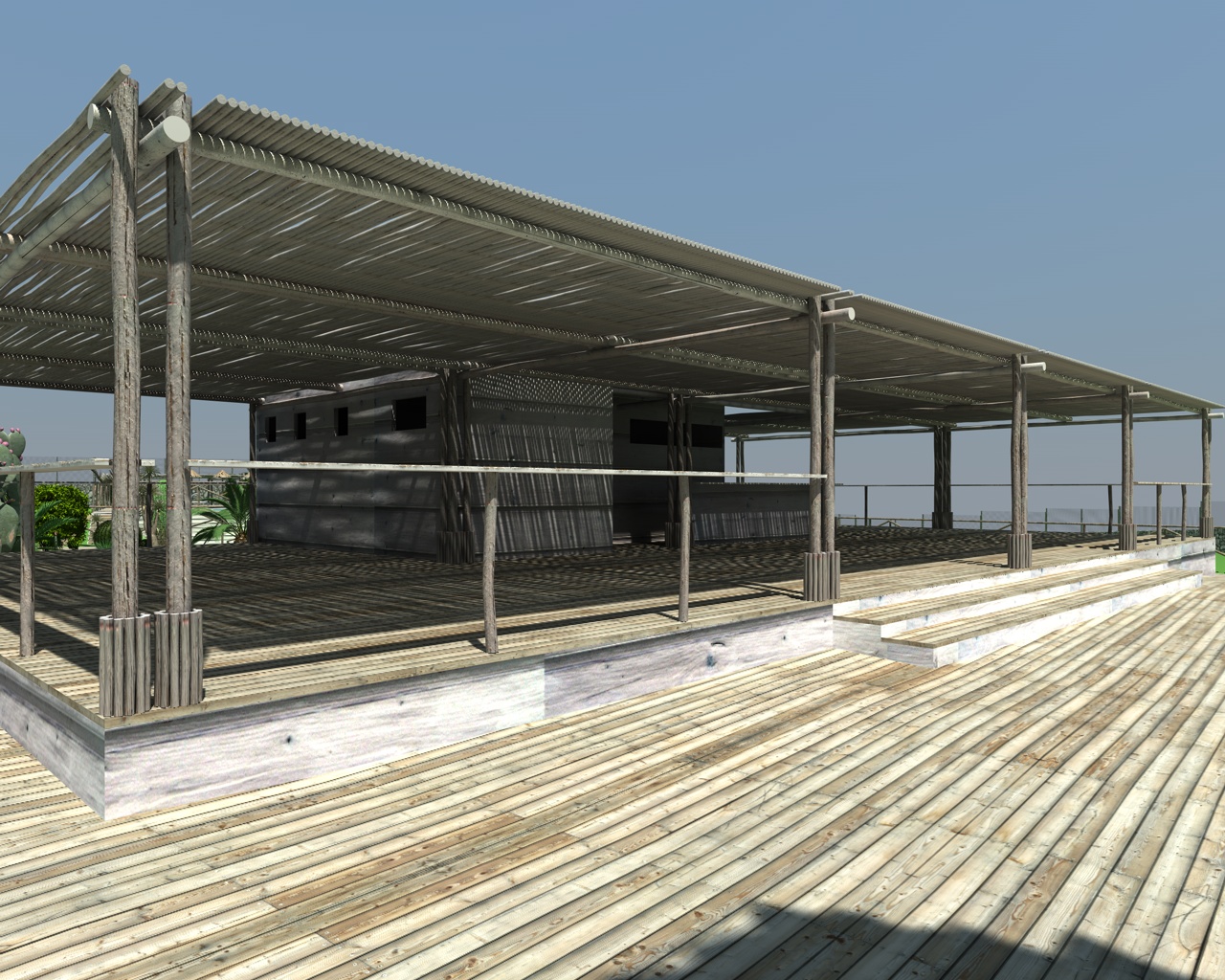 poi farei delle zone di sabbia su quel pavimento in legno. sabbia trasportata sia dagli avventori che dal vento.