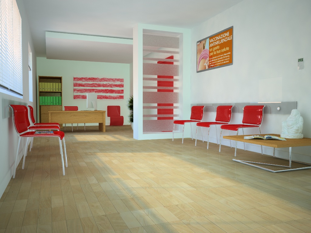 ok, ho sistemato un po di cosette, aumentato l' illuminazione e virata su un colore neutro (era troppo giallastra...concedetemi il termine). Ridotto il calibro dei faldoni, inserito una rivista (Focus) sulla sedia in primo piano e rimosso le luci che venivano dal controsoffitto.