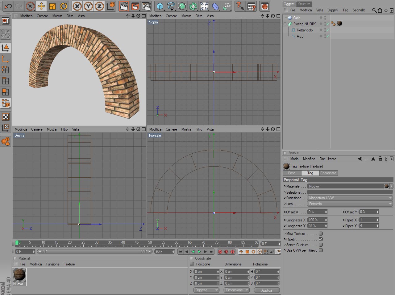 Se il problema è questo, basta che duplichi la texture che hai applicato frontalmente e la ruoti in verticale con photoshop o con il visualizzatore immagini di windows. Poi ritorni in cinema, crei un nuovo materiale, carichi la texture modificata nel canale colore, selezioni il lato esterno e quello interno dell'arco e la trascini su una parte qualsiasi selezionata e in proiezione scegli cubica. Così facendo ottiene l'oggetto texturizzato bene come vedi in allegato nell'immagine 2.