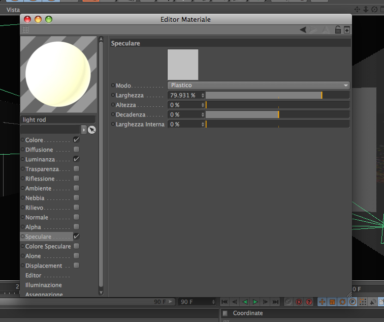Devo rappresentare una striscia di luce(un neon che percorre a soffitto tutto il lato di una stanza...con un effetto wall washer)Per fare ciò non ho usato una luce ma ho creato un oggetto con luminanza 100% texture fresnel con forza mix al 23%;e speculare plastico con larghezza 80%, altezza 0% Decadenza 0%,larghezza interna0%.