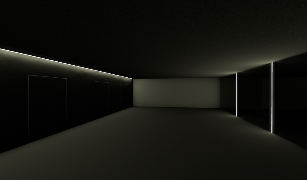 La cosa importante per me è rappresentare la luce nel modo più verosimile possibile.quindi, il neon di sinistra, per esempio, è importante che illumini la parete verticale con le tre porte e il pavimento ai piedi di quest'ultime, stesso discorso per i neon verticali sulla destra...
