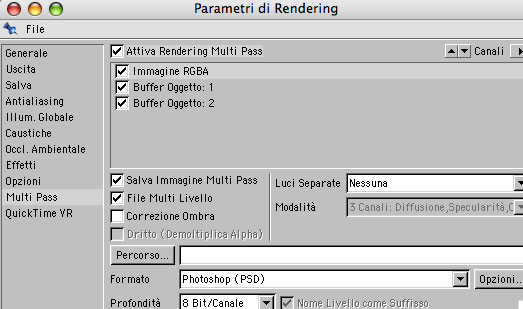 se invece vuoi un immagine multilayer di photosho devi scomporre l'immagine per canali quindi nel multipass devi attivare ad esempio immagine rgba, riflessioni se ci sono nella tua scena, trasparenze e cosi via fino a che non componi correttamente l'immagine, e questi saranno i tuoi livelli di photoshop
