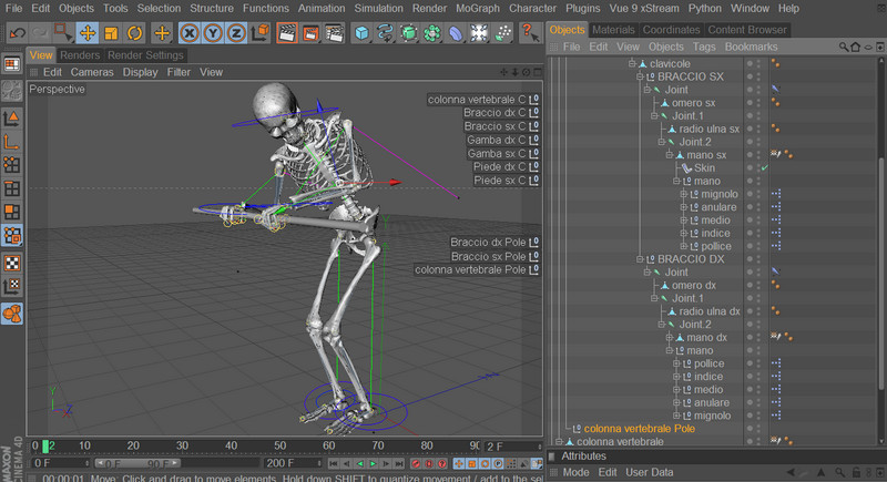 Adesso, però, mi manca il teschio: è in gerarchia con tutto il resto, cioè con le Joints della colonna vertebrale (in modo che quando muovo questa si muove anche lui in modo solidale). Vedo cosa posso fare con Xpresso per dargli i movimenti H,B,P............