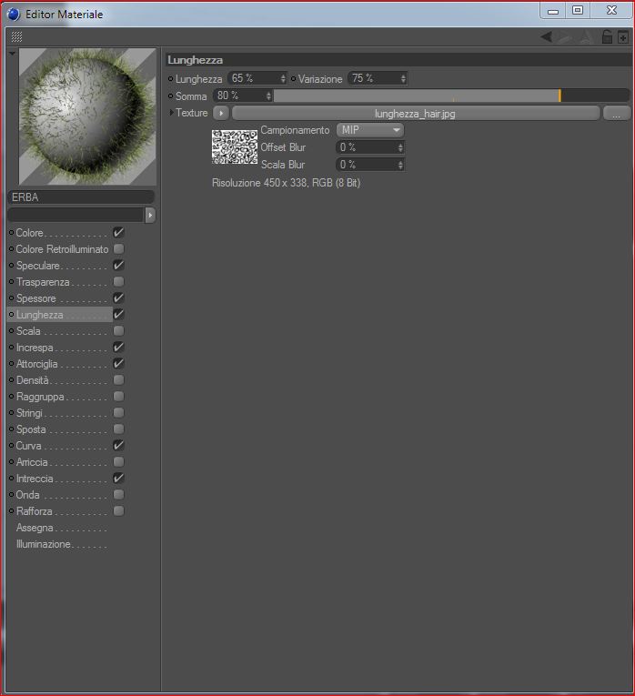 il file dal quale sono partito per renderla editabile è un file che ho già postato nel forum, è nel tuo post del villaggio http://www.c4dzone.com/it/forum/viewtop ... &start=248 nel canale lunghezza c'è applicata una tex che io ho fatto in bianco e nero )molto stupida) e ho settato così i parametri come da immagine.