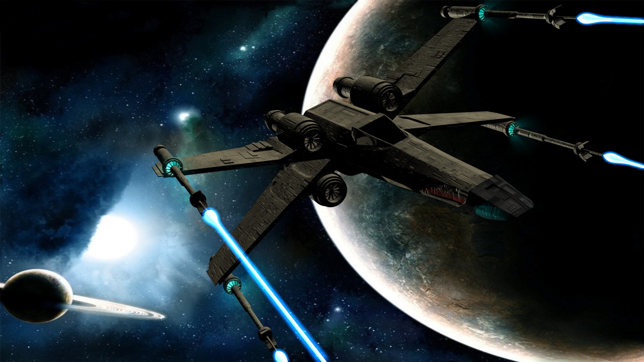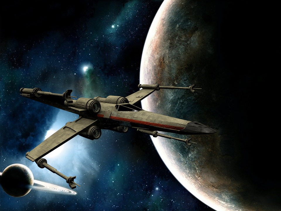 farei solo due piccole modifiche: 1) virerei sull'azzurro X-Wing (che riceve una luce fredda dallo spazio), 2) da come è posizionata l'astronave rispetto al pianeta la luce viene da dietro... quindi metterei in ombra il lato che da sulla camera e in luce l'opposto.