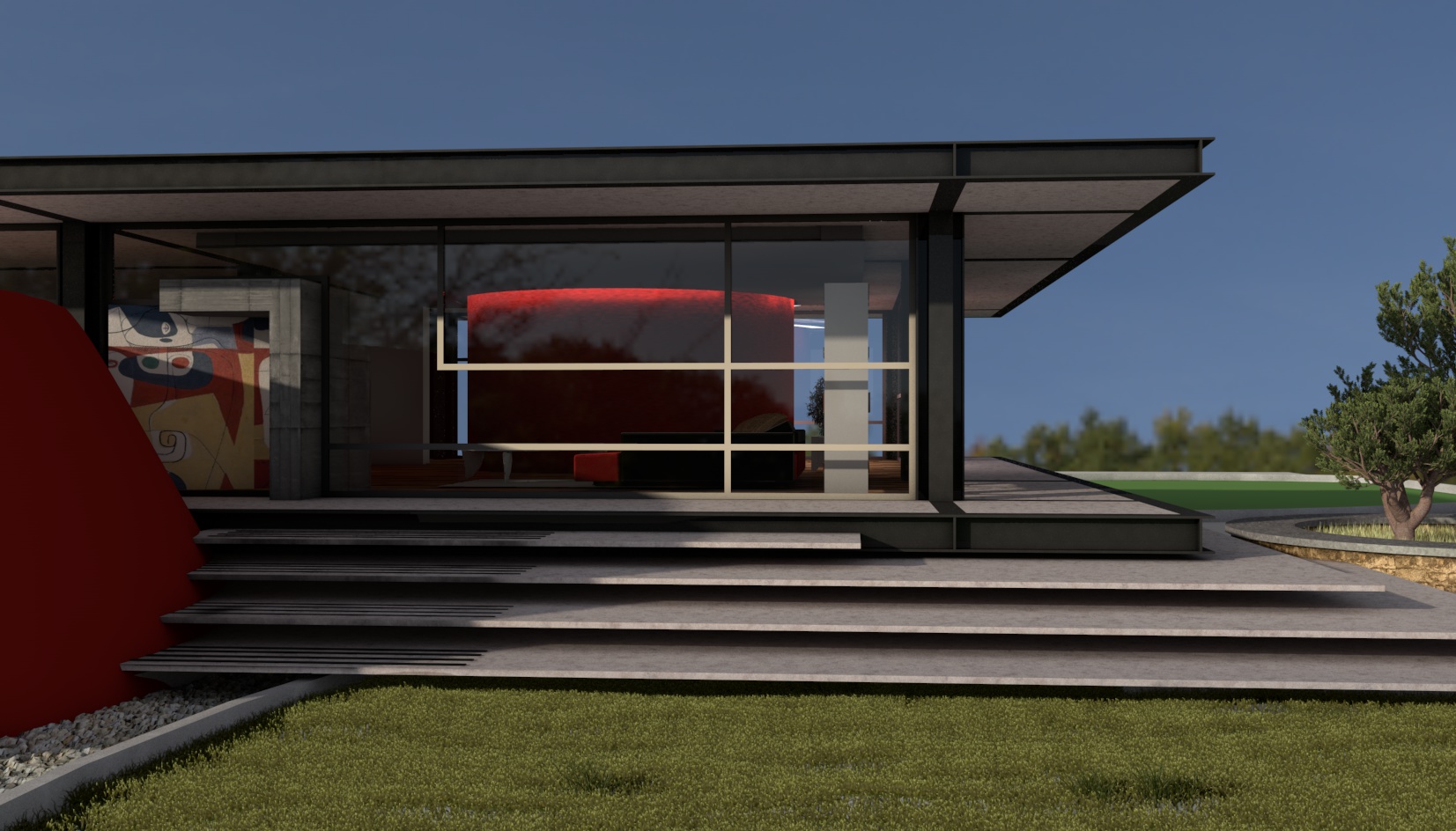 ho fatto un paio di prove con alberi su canale alpha, risultati mediocri- bruttacchi, non li posto nemmeno.... :P :P :P Piazzo la siepe e mando il render sperando in un risultato migliore, anche se effettivamente la casa è parecchio decontestualizzata....