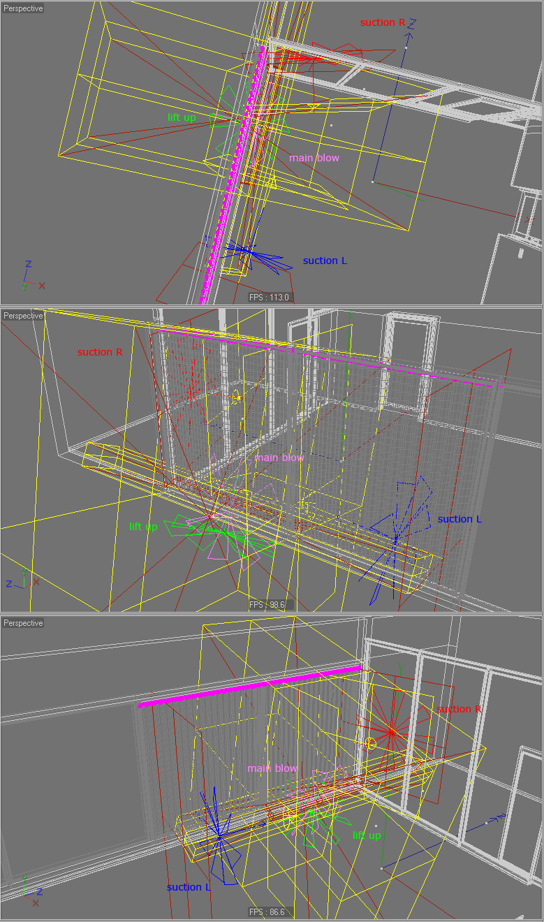 per le dinamiche ho usato il quattro campi Vento: due ai lati per simulare l'aspirazione, uno centrale principale e uno inferiore per sollevare le tende ed evitare [furbescamente] che si impigliassero alla base; per il tessuto niente di particolare: ho semplicemente fatto un paio di prove per capire quale fosse la suddivisione ottimale e poi ho applicato le "7 Regole D'Oro Dei Tessuti" [quelle della Guida]