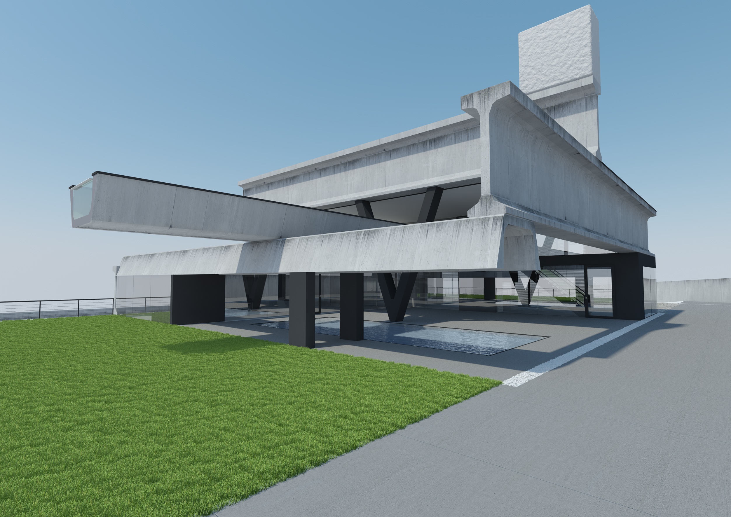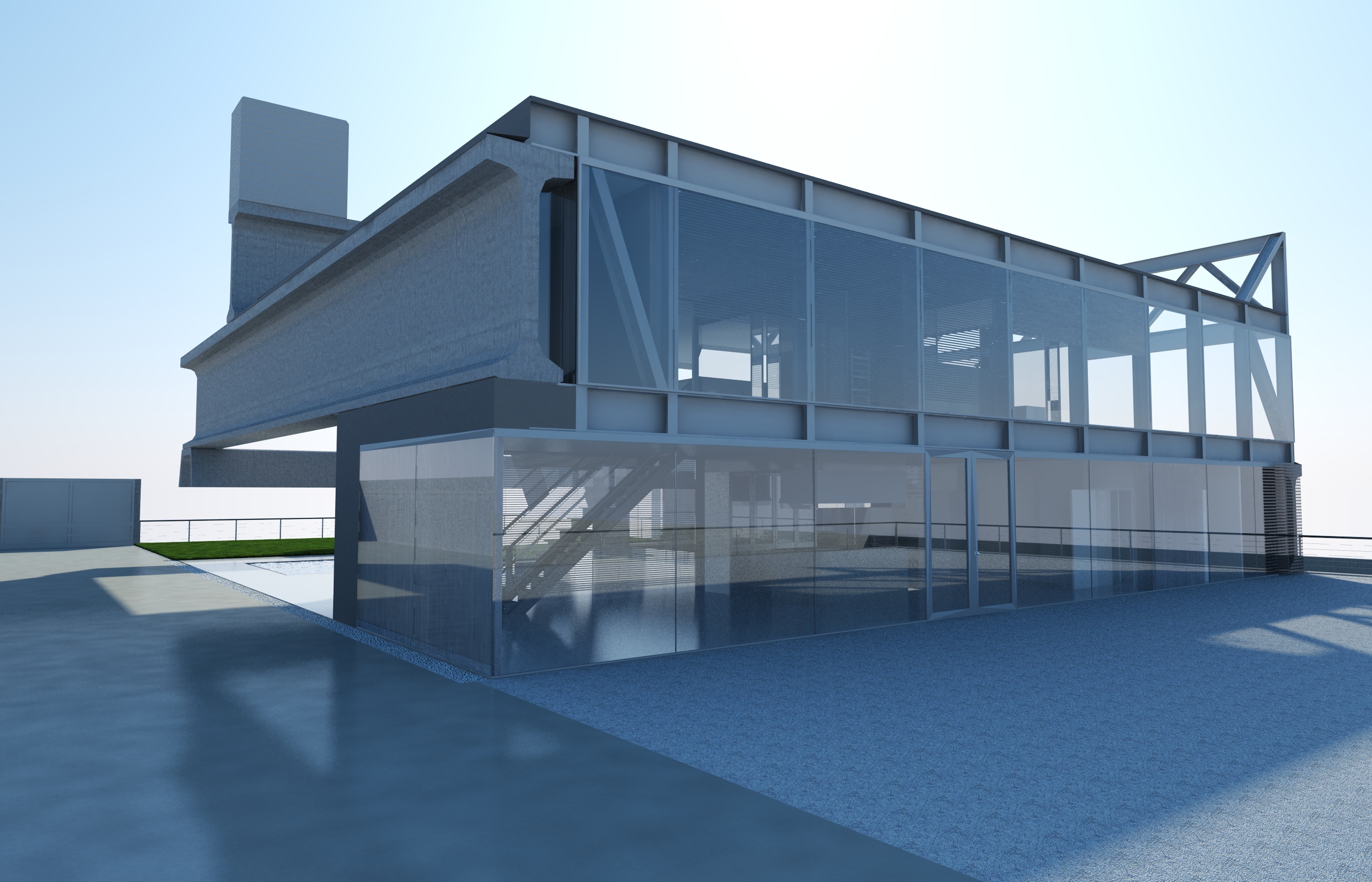 Per i pavimenti ho utilizzato un materiale abbastanza neutro che cercasse di richiamare i pannelli prefabbricati in cemento di cui è composto nella realtà.