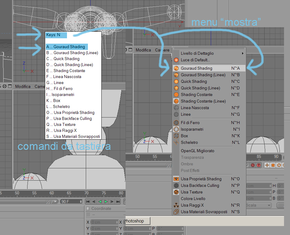 e a fianco di ogni voce vedrai delle lettere, nel caso di "gourad shading" cè scritto "n" e "a"... la "n" e la "a" sono la scorciatoia da tastiera della voce "gourad shading" presente nel menu mostra... è la stessa cosa.