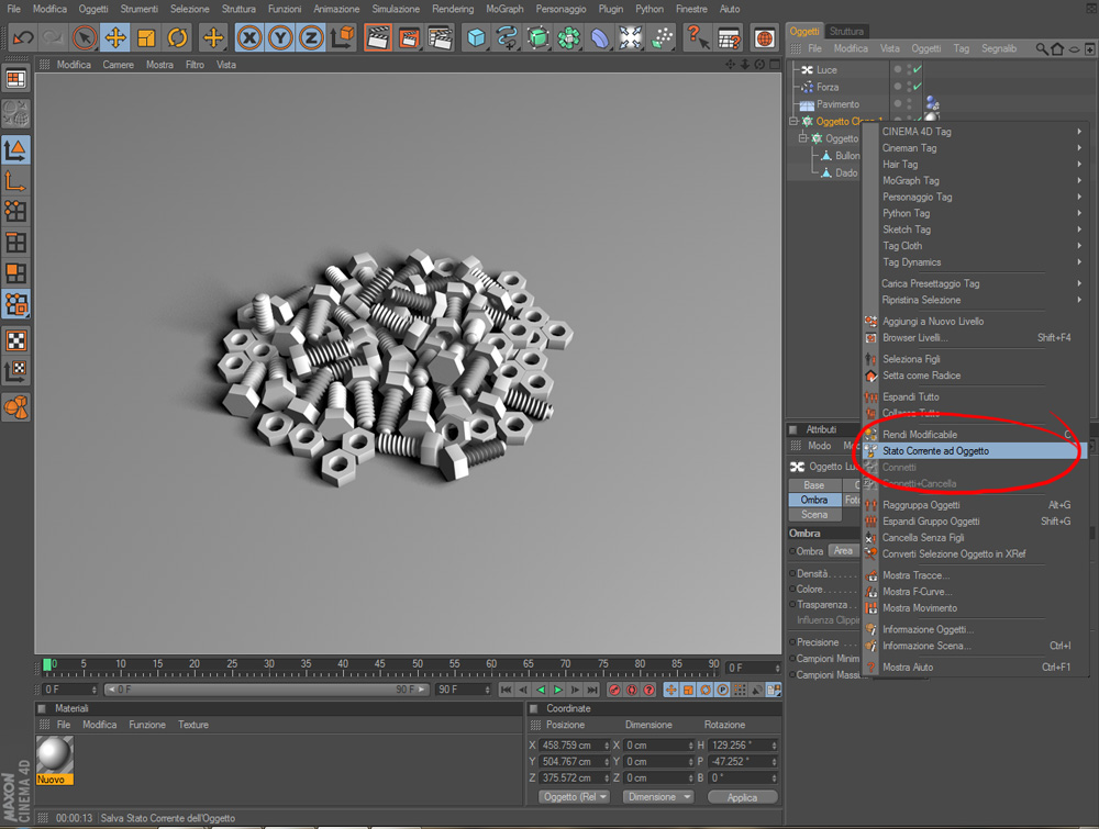 Ciao matcsat! :D "stato corrente ad oggetto" ha dato buon esito: applicandolo al cloner di mograph, ha creato in gerarchia un nuovo gruppo di oggetti contenenti dadi e bulloni, nella stessa posizione ottenuta con Mograph + dinamiche, un successone!!