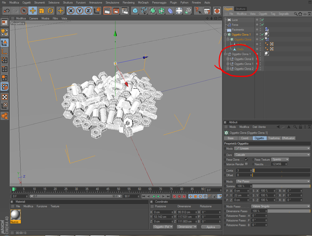 Con due oggetti (un bullone ed un dado) ho creato una serie di cloni [fig.1] che ho successivamente "ammucchiato" sul pavimento [Fig.2] con l'effetto dinamico ottenibile dal Tag "Corpo Dinamico". È mio interesse ottenere dal risultato dalla Fig.2 un file indipendente senza tutte le impostazioni di mograph, ho tentato di rendere modificabile la gerarchia della finestra oggetti oppure di esportare direttamente il progetto sotto forma di OBJ, ma in tutti i tentativi ho ottenuto come risultato quello che vedete nella Fig.3. Le impostazioni delle dinamiche applicate alla gerarchia non sono prese in considerazione. Avete ipotesi o consigli cinemisti?