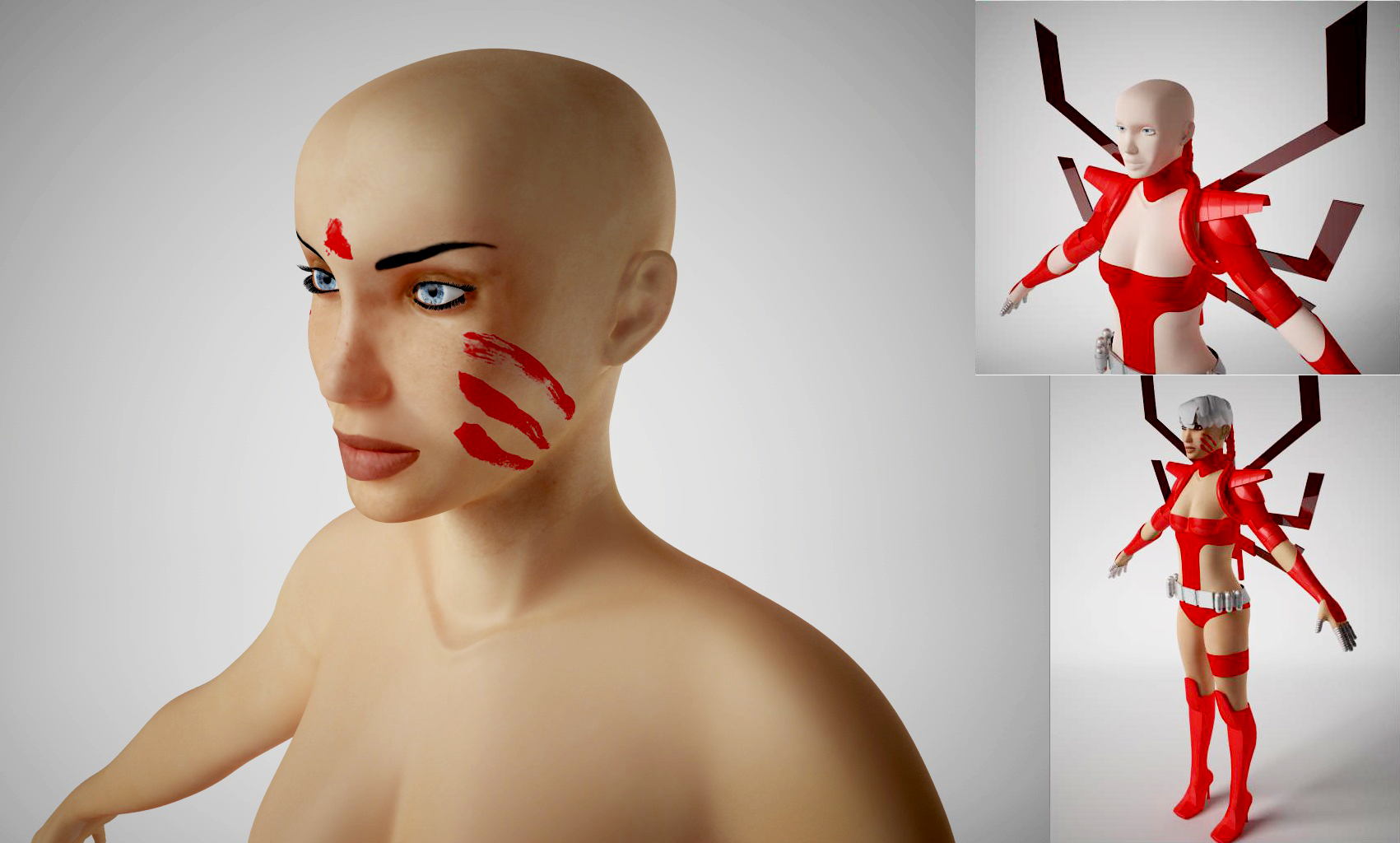 per quel che riguarda il fallimento di vray, questo è semplicemente dovuto a due aspetti: l'impossibilità da parte del mio pc di renderizzare l'armatura con tutte quelle riflessioni ( ogni volta che mandavo il render il mio portatile si spegneva e sottolineo "si spegneva" ) e poi l'incapacità, da parte mia, gestire il modulo hair fur per la realizzazione dei capelli. il risultato era imbarazzante e la soluzione con i piani e le texture non mi soddisfaceva pienamente