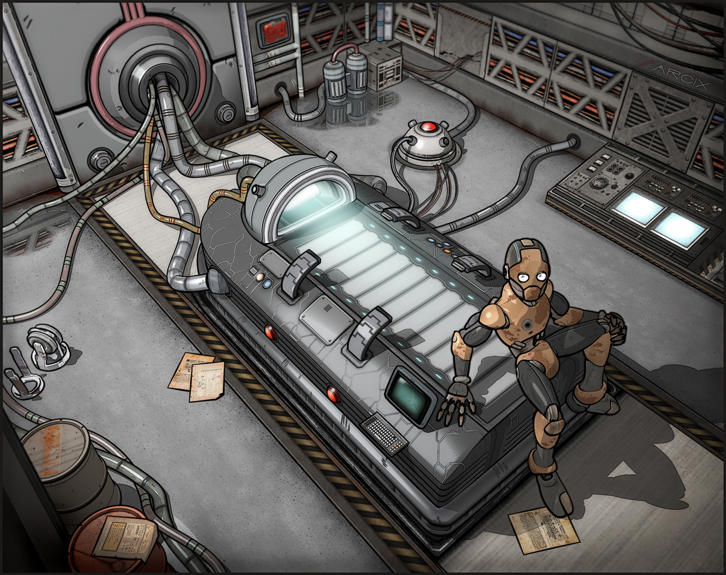 Mentre cercavo tra i vecchi file, ho ritrovato il laboratorio che avevo iniziato anni fà, così l' ho ridimensionato e completato, inserendo anche uno dei robot e creando un immagine di presentazione, spero vi piacca il solito effetto sketch-cartoon che dò.