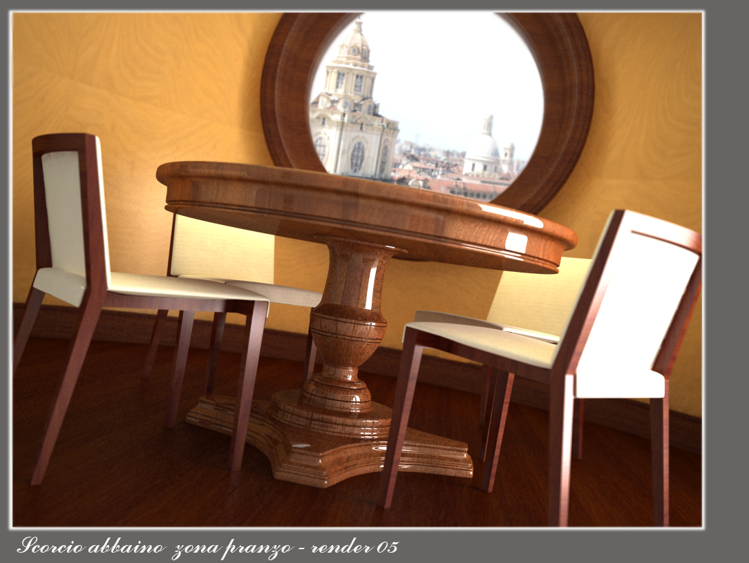 un piccolo render di interni e modello omaggio di tavolo con sedia di Grassi.