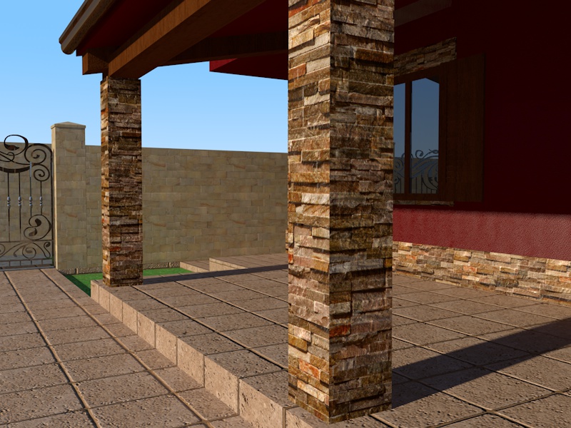 La pietra sul muro della casa (parte bassa) e quella che riveste gli architravi è orrenda. Non utilizzare la stessa texture dei pilastri.