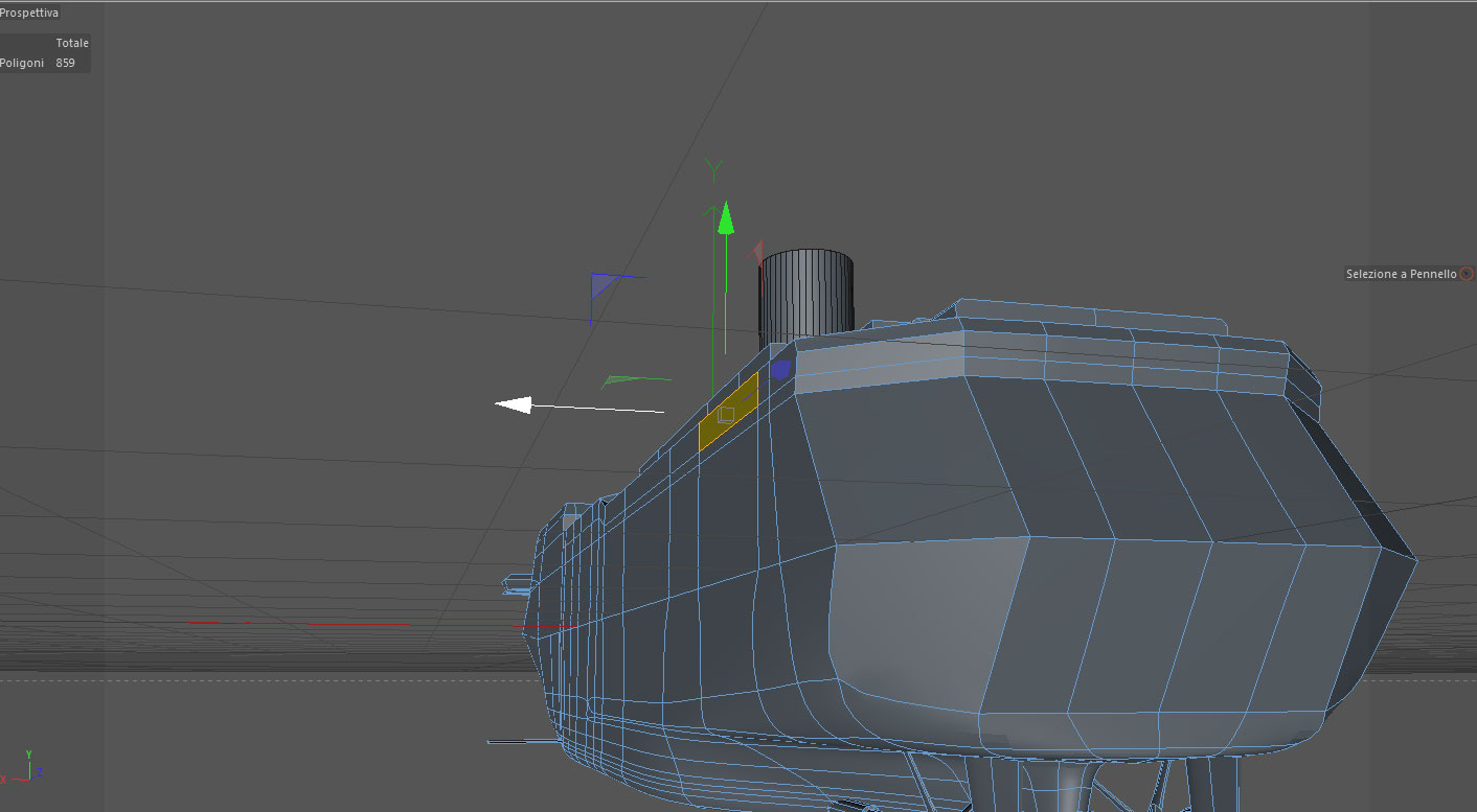 Qui taglio la parte frontale. Estrudendo le superfici verso l'interno ricaverò i ponti di prua