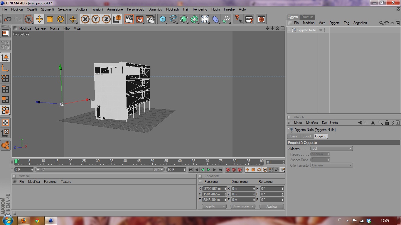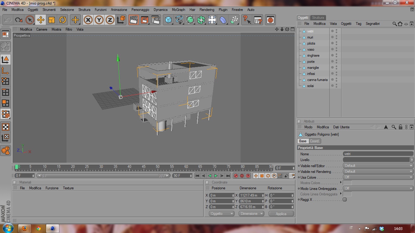 - Inserisci un pavimento di cinema4D che trovi negli oggetti di scena, in alto tra le luci, e' un pavimento infinito e arrivera' fino all'orizzonte, e' una base d'appoggio che dovrai verificare sia a zero, l'architettonico ce lo poggi sopra