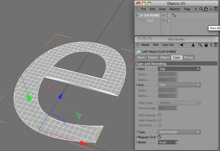 • Con una spline testo inserita dentro a una LOFTNurbs ti credi la base piana della lettera, nelle opzioni dei tappi scegli come tipo Quadrangoli e Griglia regolare, convertendo poi tutto in poligoni (premendo C)