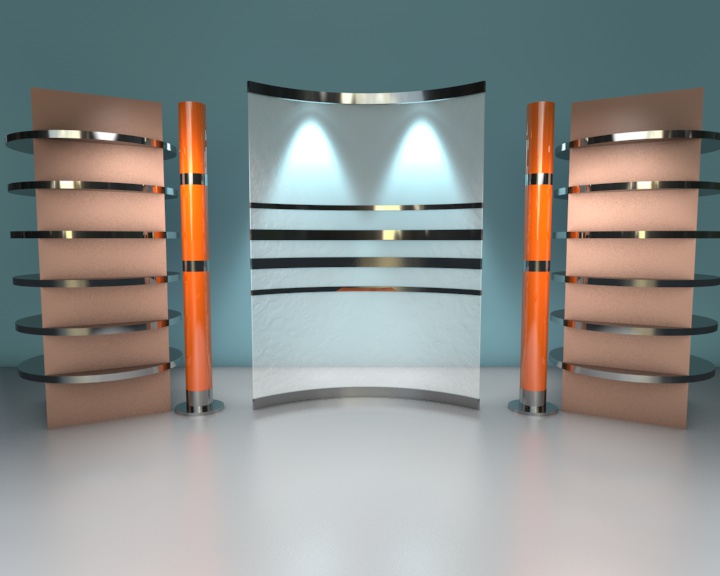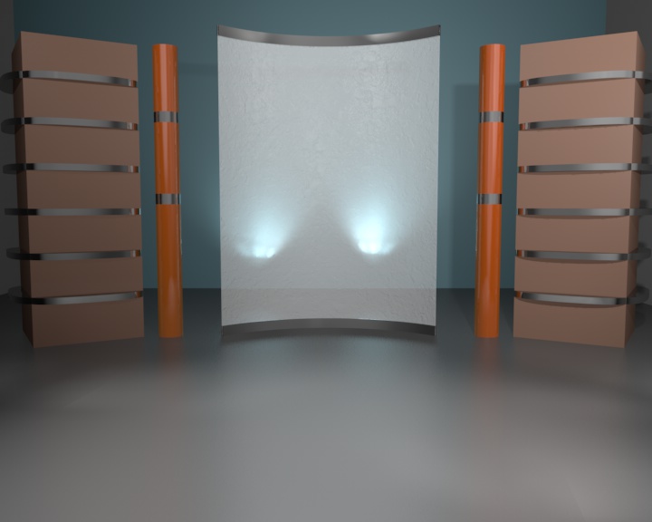 Per quanto concerne la disposizione delle luci: ho due spot IES che illuminano la parete di fondo azzurrina, due spot IES che illuminano i due prismi "rosa" ai lati ed uno spot (normale) che mi illumina il pavimento.