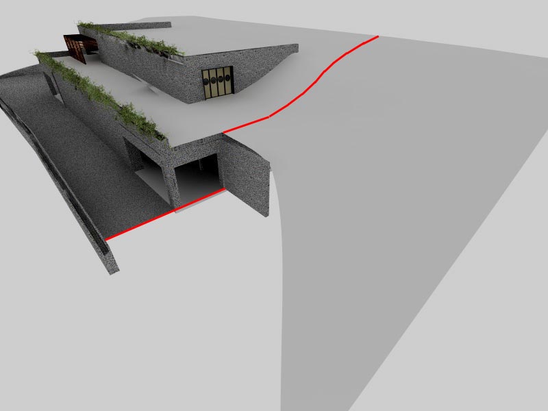 La line rossa rappresenta la spline che dovrei realizzare per far tornare la mia figura, lo scopo sarebbe quello di creare un accesso alla cantina da entrambi i piani