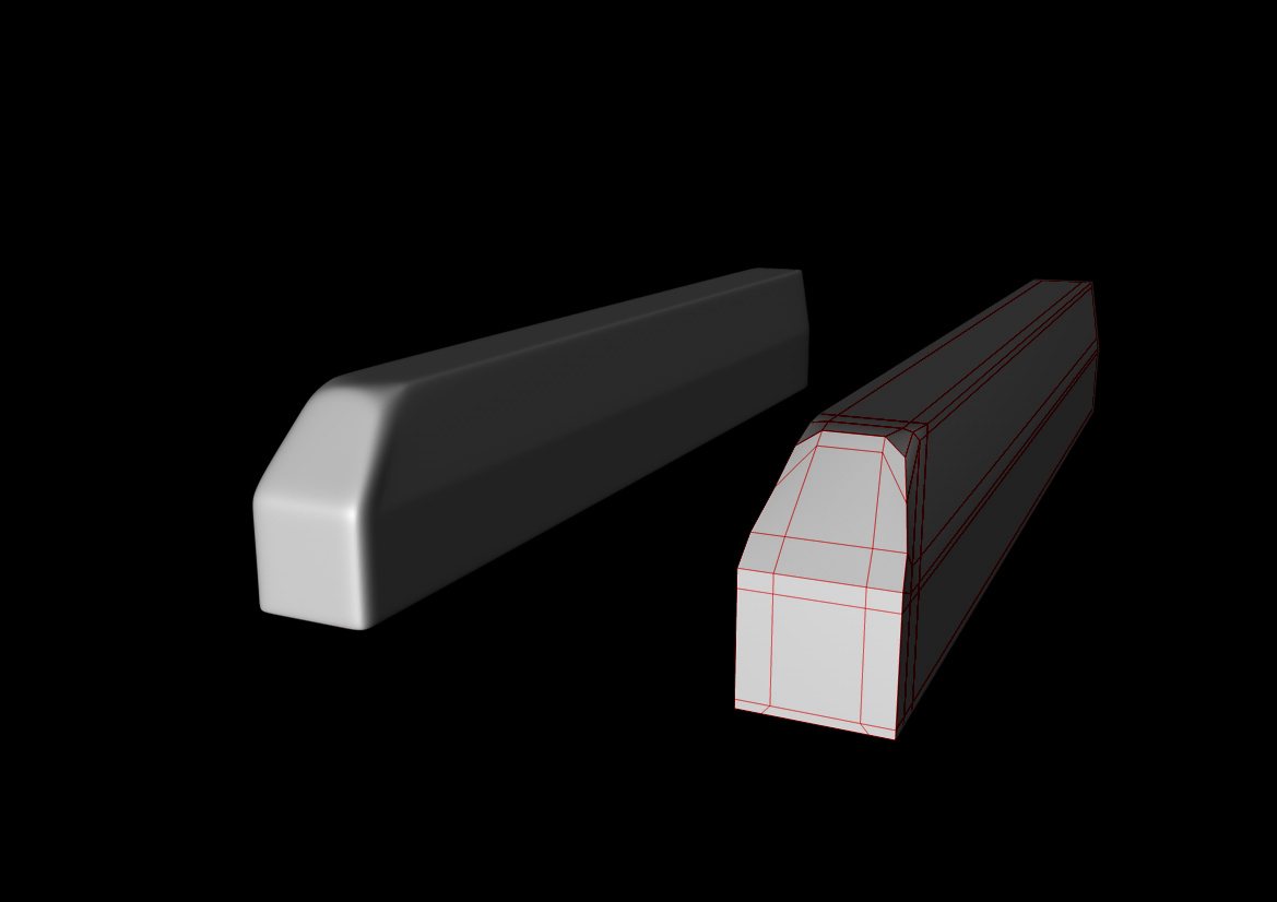 Questo è il risultato migliore che sono riuscito ad ottenere fino ad ora estrudendo internamente le facce e inserendo l'oggetto in una HN, ma come vedete la smussatura è troppo "tirata". Io non ho ancora ben capito il comportamento delle HN, quindi può darsi che bastino pochi aggiustamenti alla mesh per avere un buon risultato, però chiedo a voi perchè se così fosse non saprei come fare, e se fosse possibile farlo in un altro modo non mi è ancora arrivata l'ispirazione.