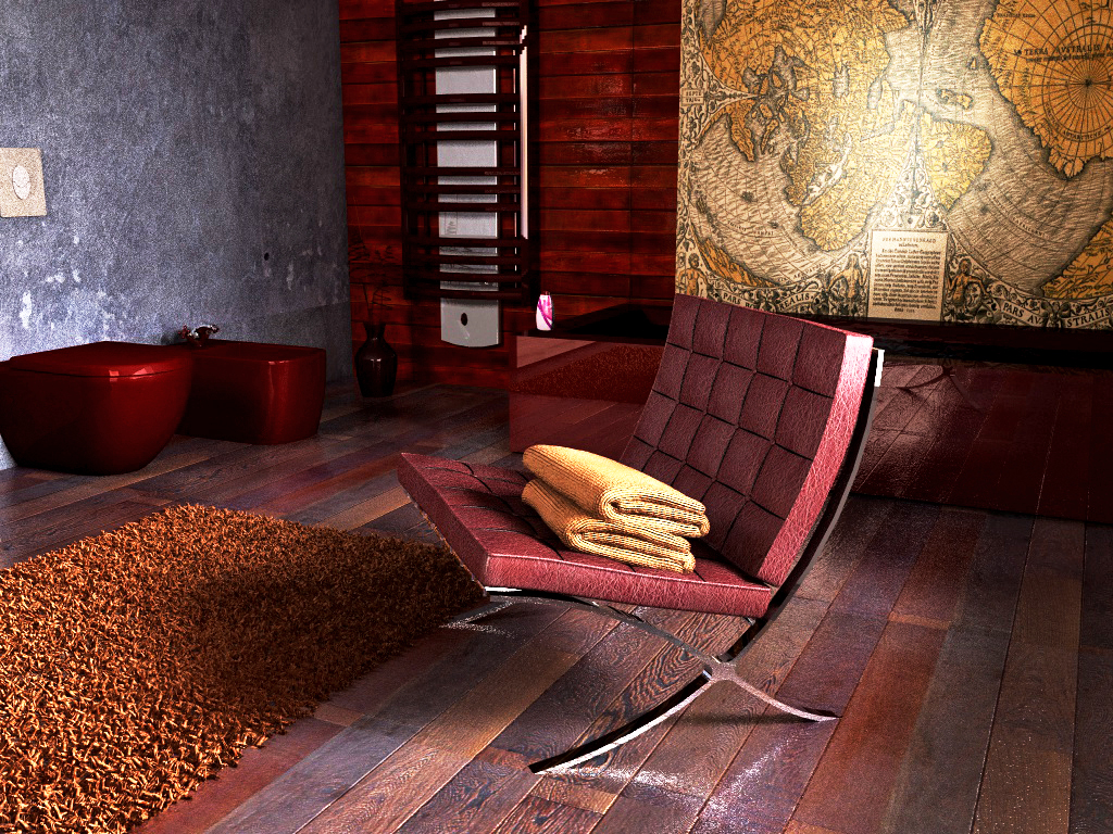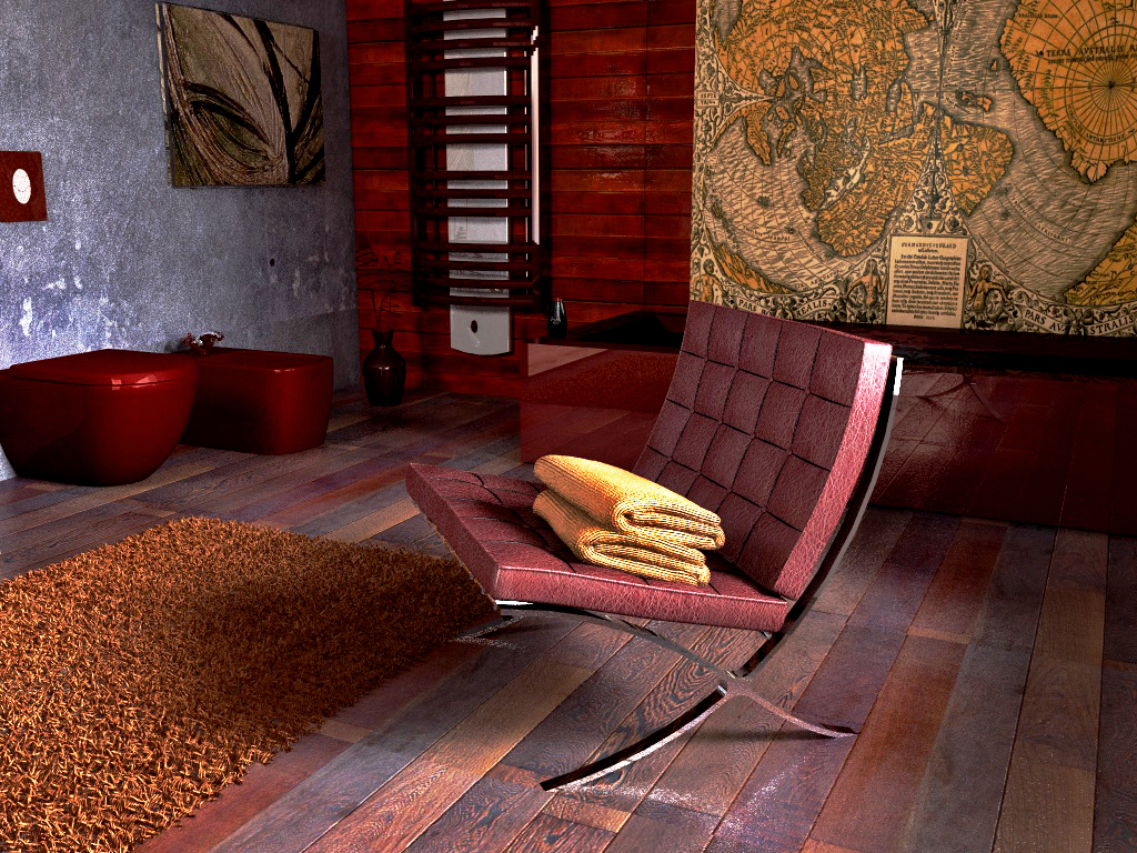 il planisfero a destra è decisamente migliorato, anche il pavimento un pochino meglio, anche se ancora c' è da lavorarci un po' secondo me. Stessa cosa per il tappeto. Se vuoi consigli più specifici ti conviene postare i parametri delle cose che no ti convincono, con i materiali di riferimento per regolarsi. Attenzione alla poltroncina mies che affonda nel pavimento. La pelle rossa non mi convince moltissimo, e nemmeno la parete in fondo, che eccede in bump e forse anche in riflessioni. Che materiale volevi ottenere? Lo sciaquone è ancora piuttosto bruttarello.... 8-) 8-)