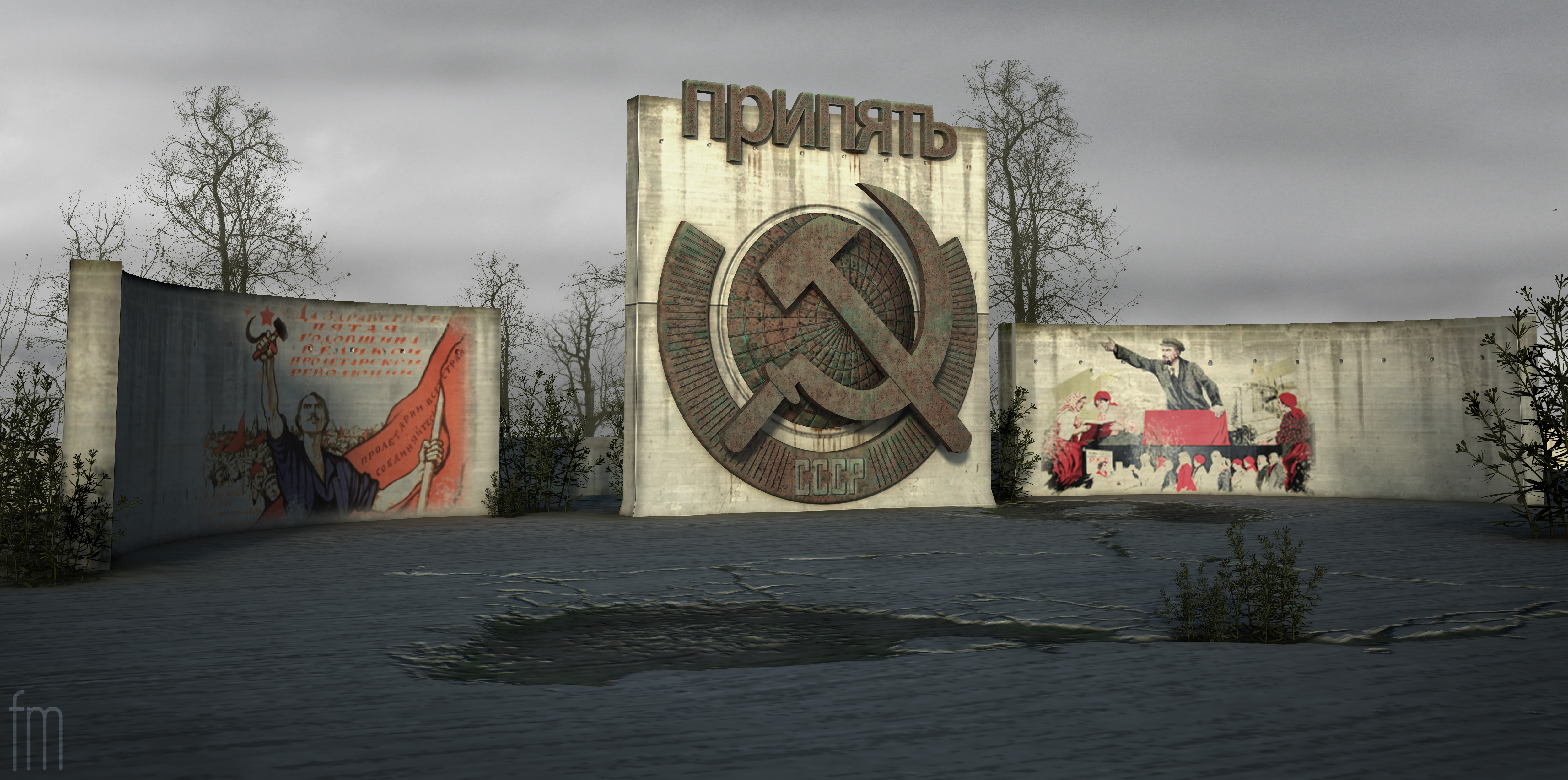si tratta di un ipotetica piazza/scultura situata all'ingresso della città di Pripjat, la città abbandonata in cui abitavano i dipendenti della centrale nucleare di Chernobyl. E' stato un buon esercizio di mappatura UW, texturing e postproduzione.