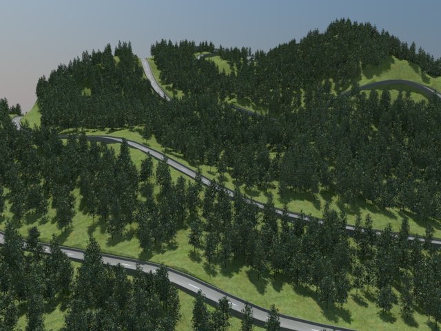 A questo adesso devo aggiungere le strade che lo attraversano. Strade che ovviamente si adagiano sui pendii, ma che ovviamente, inquanto strade, hanno le loro sezioni trasversali orizzontali nella realtà.