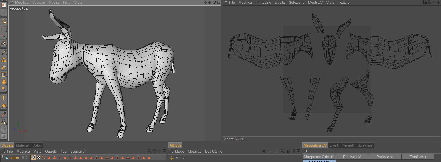morph wrote:le zampe e le orecchie, che sono delle geometrie che possiamo definire cilindriche ... per cui per questi elementi ho effettuato anche delle selezioni di lati che mi dovrebbero consentire di srotolare le loro mesh in maniera più consona.