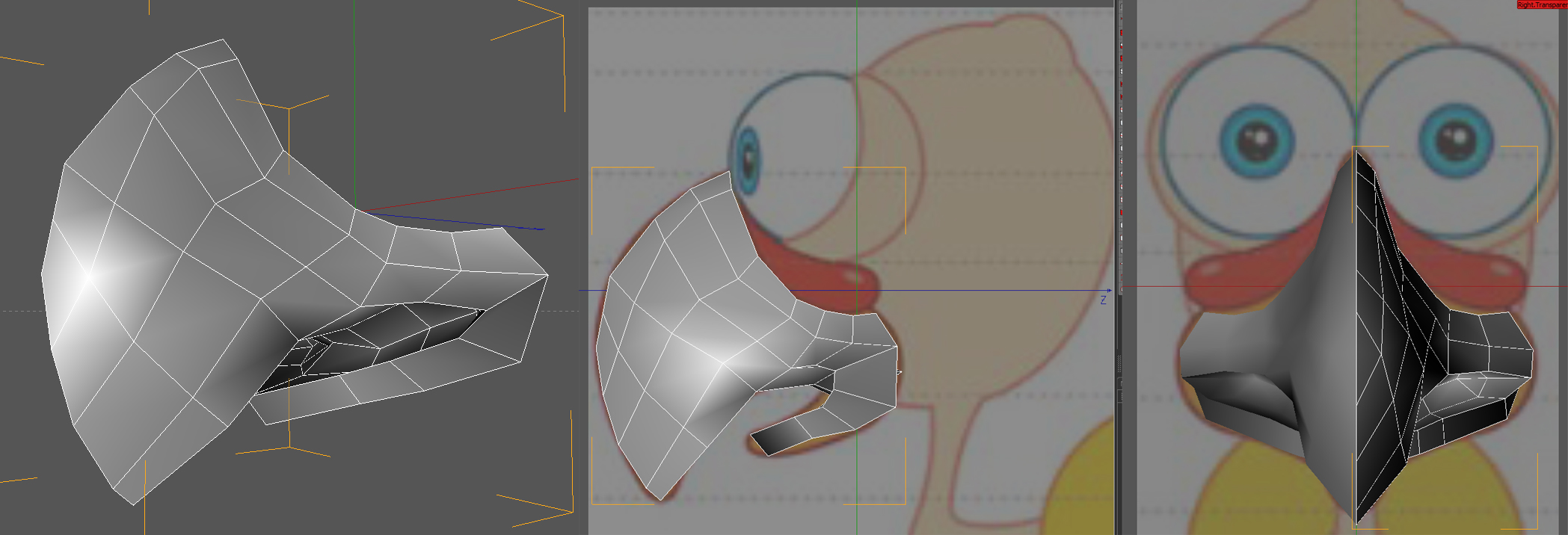 molto simpatico ! :) Mha io lascerei il becco proprio come oggetto separato.. la forma di partenza penso possa essere un cubo con qualche suddivisione, ma non sono espertissimo di modellazione organica. Altrimenti mha, potresti partire da una serie di punti che seguono il profilo del becco all'attaccatura con la testa, e poi da li estrudere gli edge, ma forse è più incasinato.
