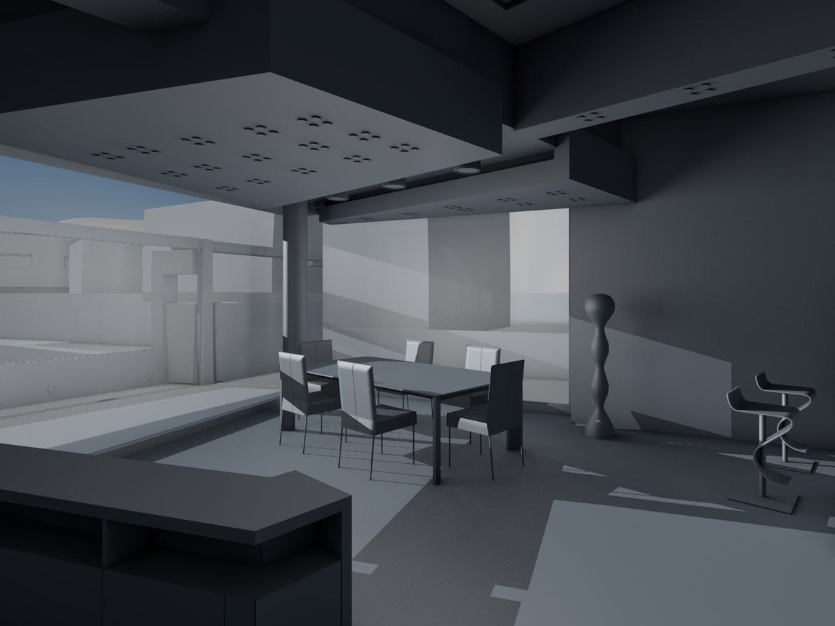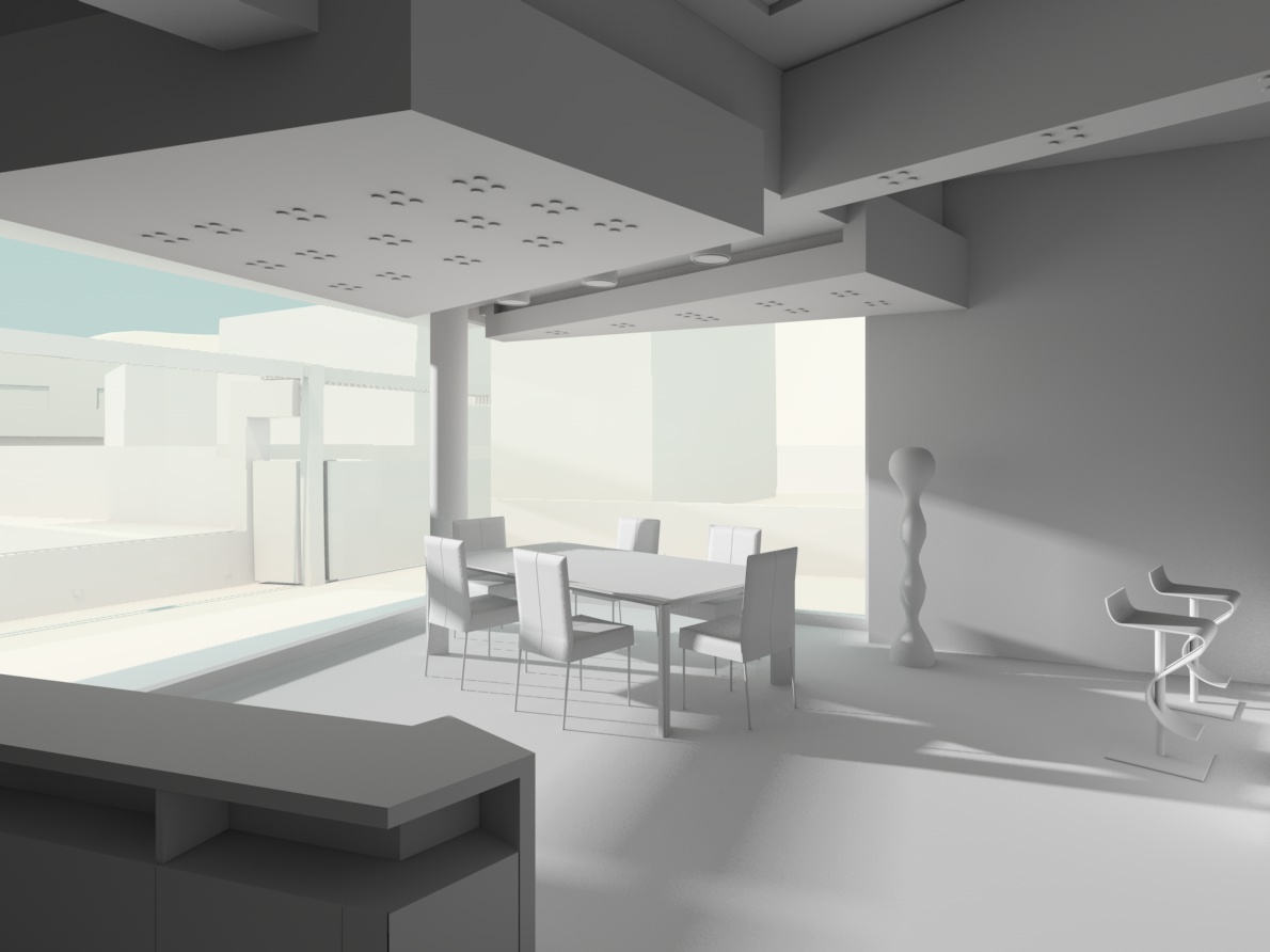 Luci infinite (esterne in corrispondenza delle vetrate e puntate verso il tavolo) : intensità 200, ombra netta