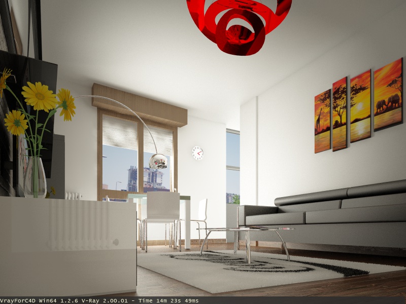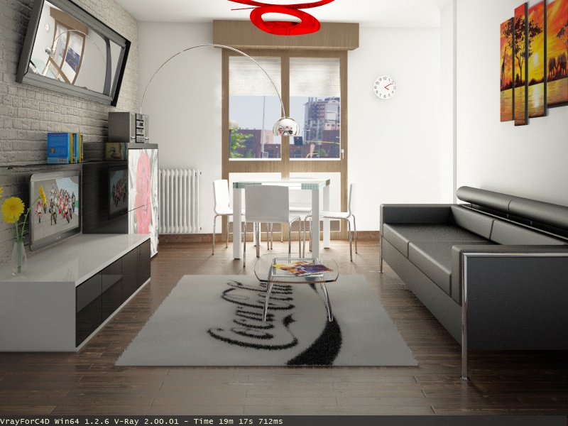 Questo voleva solo essere un esercizio per provare diverse tecniche che si utilizzano con Vray tipo: il DisplaceMaterial per il muro a facciavista; il VrayOverrideMaterial per i pavimenti in legno; il canale alpha per la rosa del mobile; l'inserimento di un paesaggio nello sfondo; il Vrayfur per il tappeto; e soprattutto per migliorarmi nell'illuminazione tramite l'utilizzo di luci AREA con il PHISYCAL SUN+SKY.