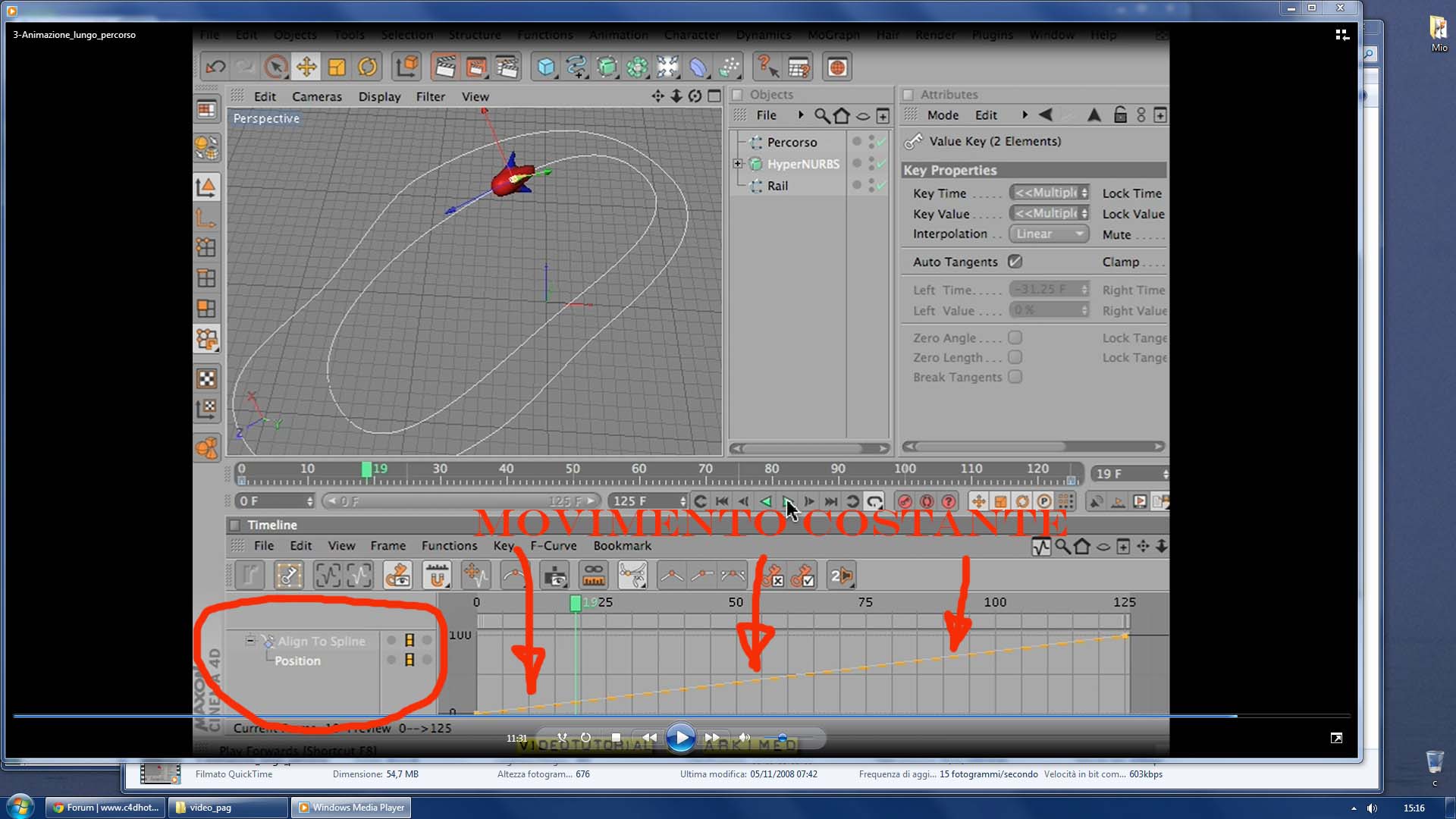 Ho cercato di seguire il suggerimento in un tutorial sulla interpolazione lineare e mi consiglia di aprire la finestra "timeline" da dove si vede la linea del movimento che è costante (interpolata, appunto); come da immagine
