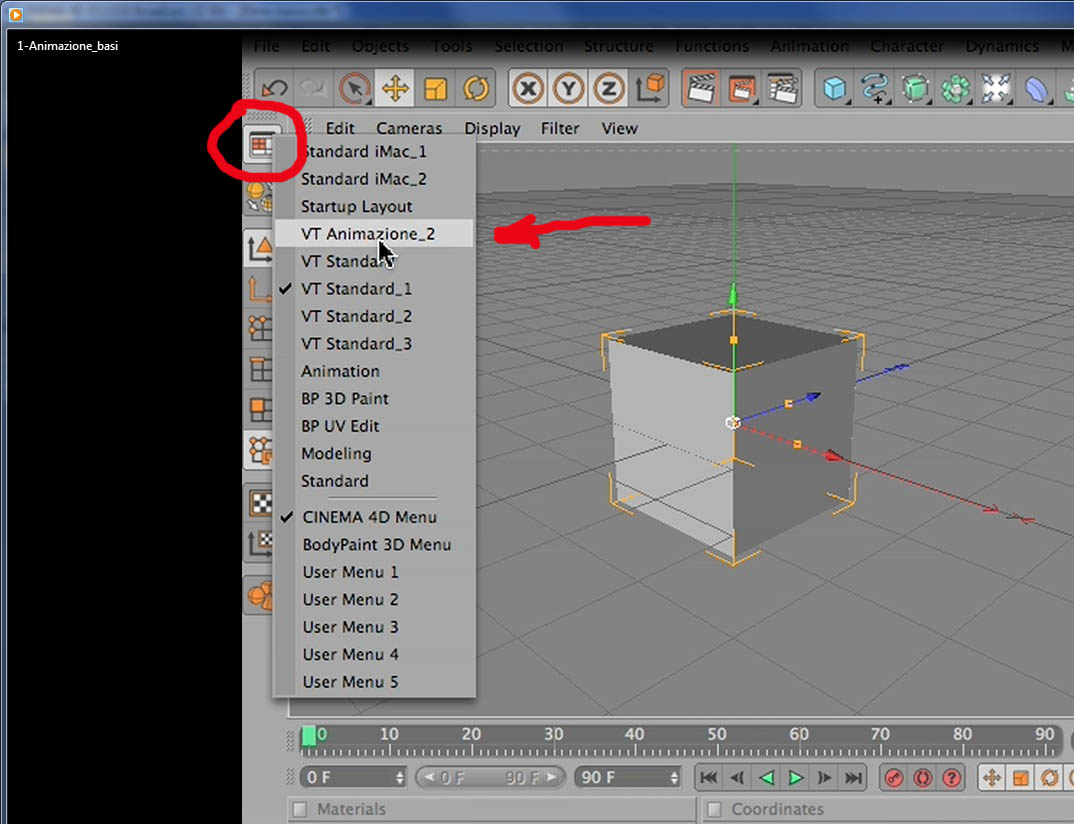 Per non fare la figura dello zuccone sono andato a rivedere il tutorial ed ho visto che lui clicca sull’icona in alto a sinistra, e gli si apre un menu dove lui sceglie “VT-Animazione_2”.(foto1)