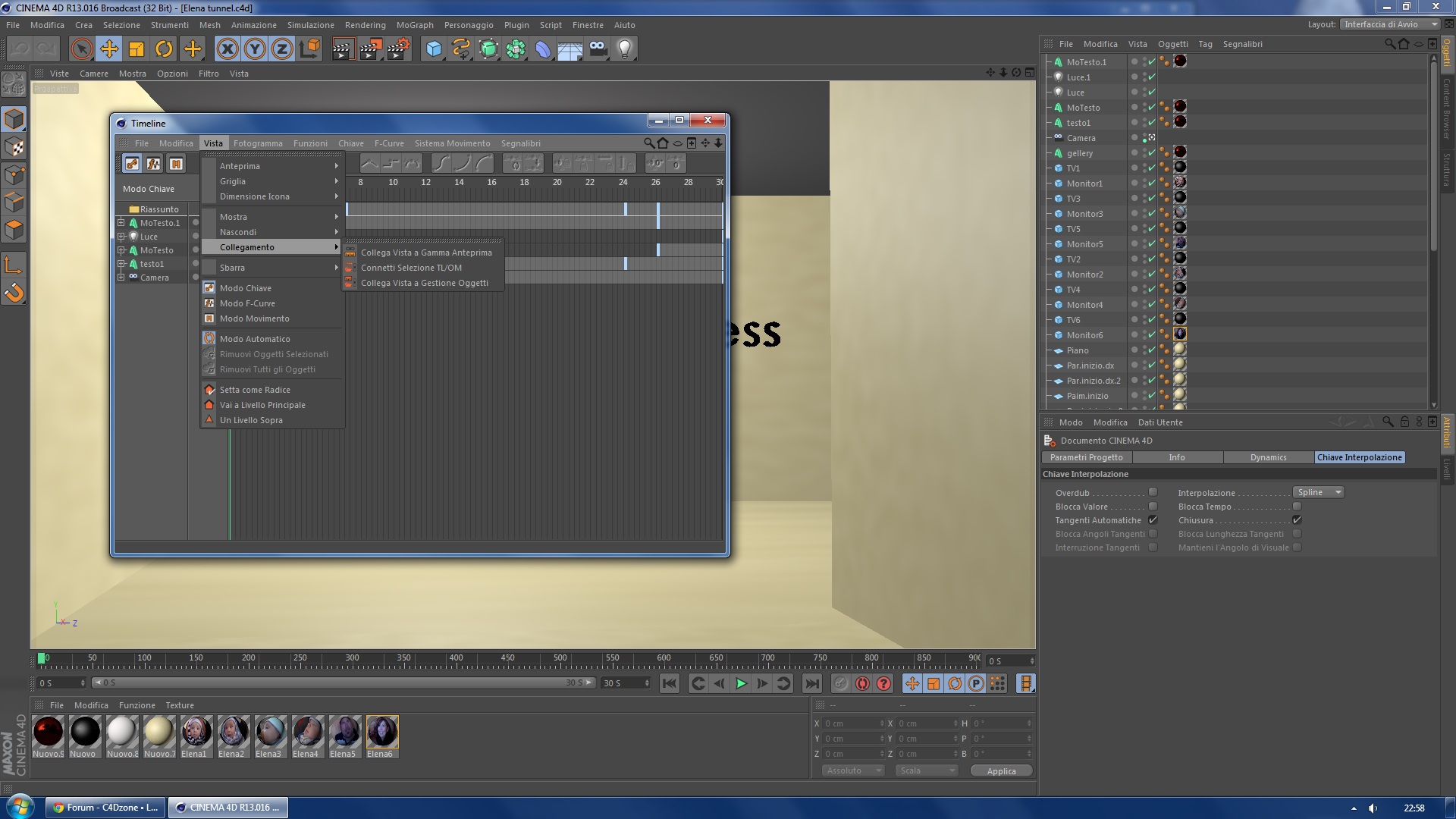 Per quanto riguarda tutta la lista di oggetti che appare (o meno) nella timeline, tutte le opzioni sono nel menù Vista (non quello delle prospettive, ma quello della timeline), assicurati di avere le opzioni giuste attivate, specie nelle sezioni Show e Link. Come ti ho detto, a mali estremi puoi trascinare a mano gli oggetti direttamente dall'object manager nella timeline. Per capire a cosa servono tutte quelle opzioni, dai un occhiata all'help di cinema.