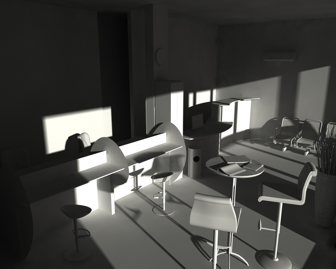 innanzi tutto si ha una luce diretta (sole), che noi spesso simuliamo tramita una luce con punto all'infinito e ombre area, poi abbiamo una illuminazione diffusa che è quella che realmente illumina l'interno degli ambienti che è data da tutti i raggi solari che si propagano all'interno dell'ambiente passando attraverso le bucature e solitamente quindi si raccolgono in un fascio di luce che ha come vettore principale, un raggio perpendicolare alle pareti vetrate dalle quali passa. Quest'ultimo quindi noi lo simuliamo attraverso delle luci area poste parallelamente alle superfici vetrate e nelle loro pià prossime vicinanze. E' ovvi quindi che anche queste generino ombre.
