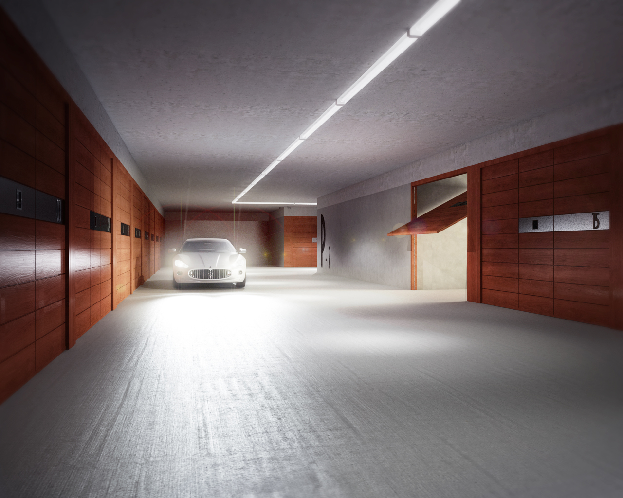 Questa prima immagine riguarda le impostazioni delle luci.. la scena è composta da diverse luci IES proiettate dall'alto, da una luce area con temperatura colore più calda inserita nel garage e da una luce area principale lunga come il corridoio senza l'attivazione delle ombre per illuminare generalmente la scena.