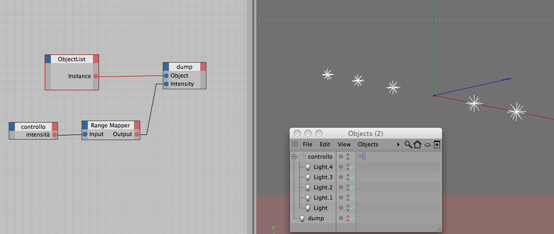 puoi usare sia l'object list che il nodo hierarchy, con l'object list forse fai prima cmq. In pratica aggiungi alla scena una luce che servirà da istanza generica per tutte le luci, dal nodo Object list connetti l'output Instance all'input Object della luce generica e poi il range mapper all'input dell'intensità. (nell'object list chiaramente devi mettere tutte le luci che vuoi controllare)