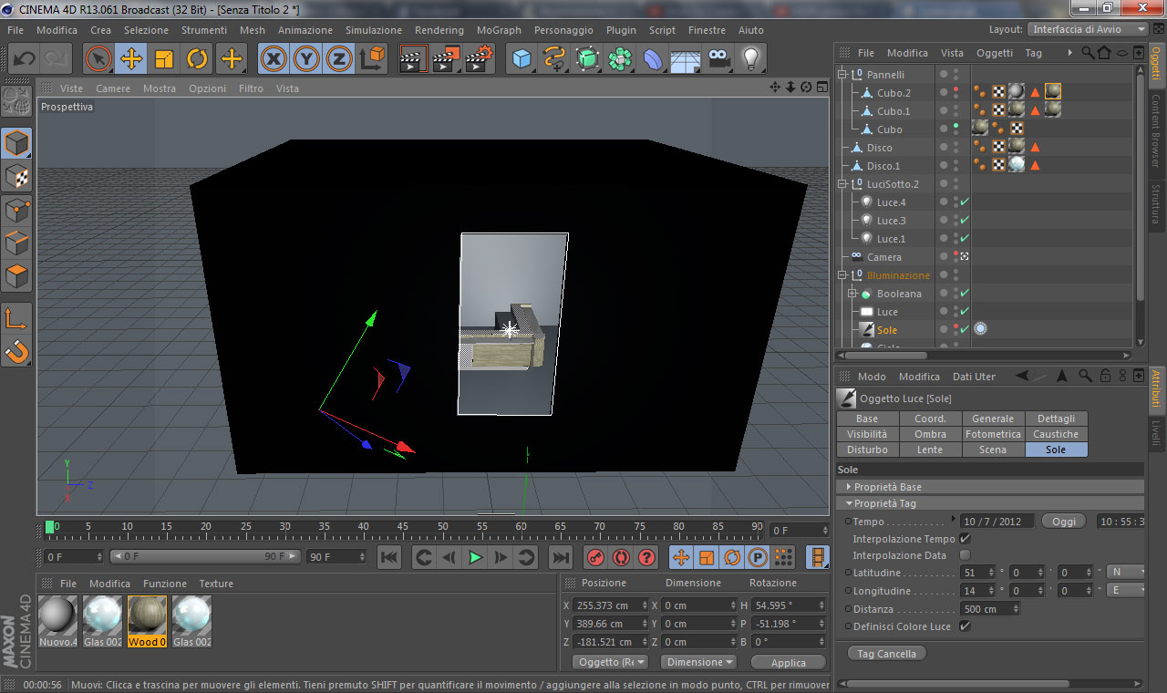 In questa scena ho messo: illuminazione globale, occlusione globale, una finestra con una luce area della stessa dimensione della finestra, sole con orario 10:00 e cielo.