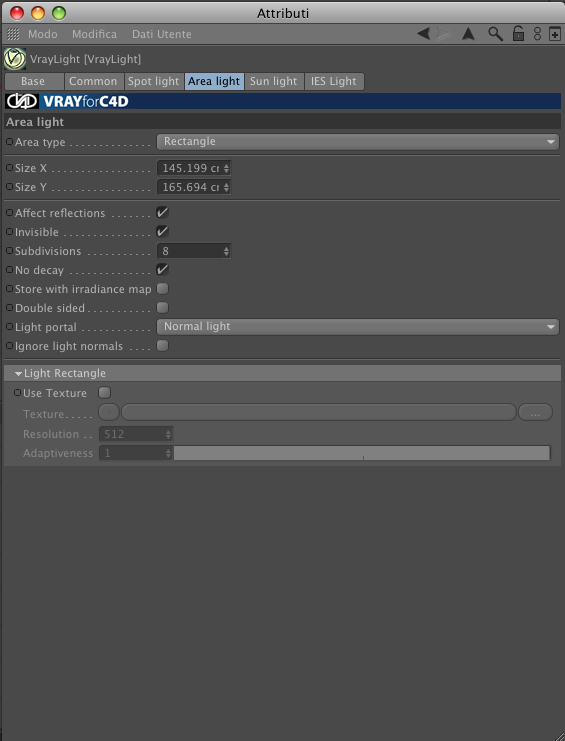 i parametri della luce area sono come in allegato. so bene che le subd a 8 sono molto basse...e di solito non lascio spuntato no decay. cmq sia davvero va considerato che mi sono trovata davanti al problema nella fase super-iniziale del render, quindi non ho curato ancora i parametri (stessa cosa vale per i parametri di render che posto tra poco). magari come modus operandi è sbagliato...anzi sicuramente lo sarà. io non sono esperta di render...sono un architetto e mi tocca farli perchè nel mio studio me li chiedono...ho cercato di imparare da me, tra tutorial e forum, ma il tempo è quello che è.