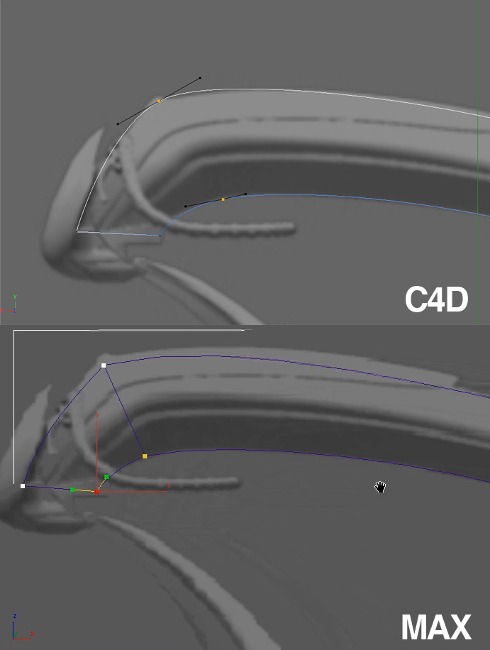 Posso chiederti perchè l'utilizzo delle spline ? Forse in cinema converrebbe usare una vera geometria, partendo da un poligono vuoto ed aggiungendo via via i punti lungo il profilo. A quel punto poi potresti unire i punti a coppie con lo strumento Bridge